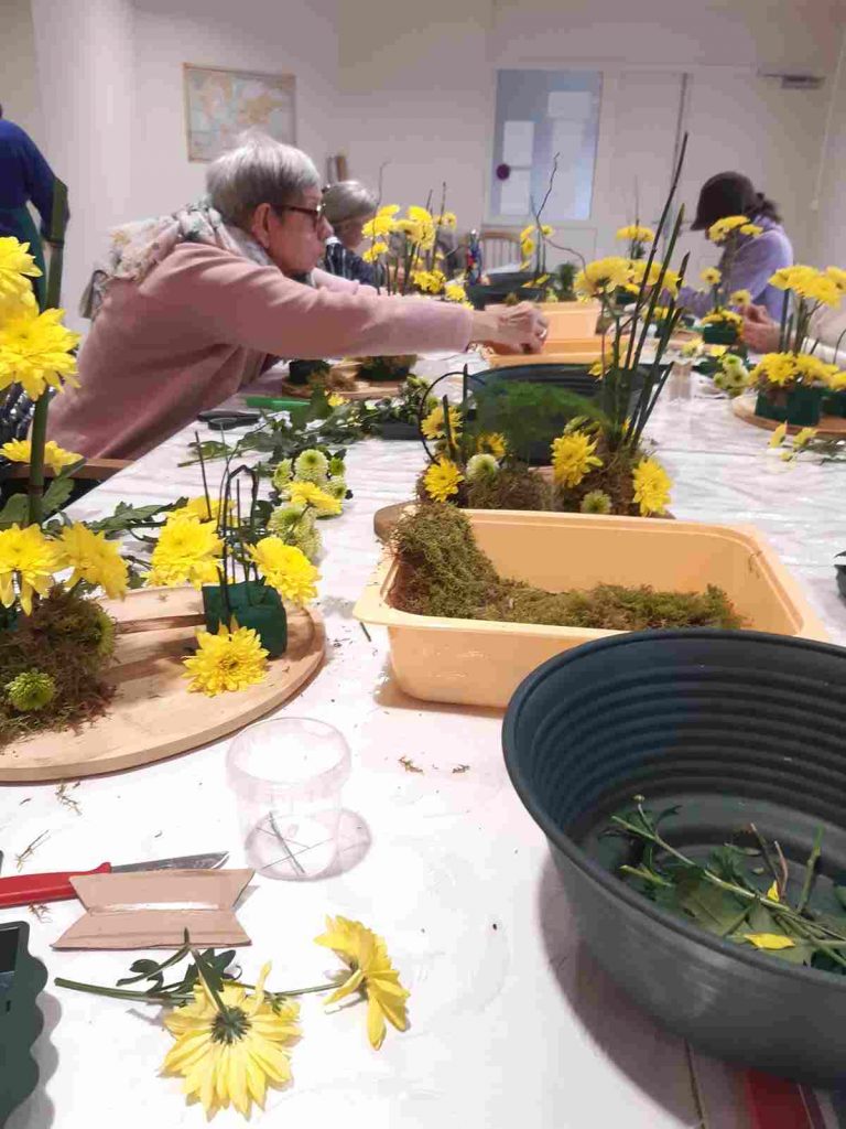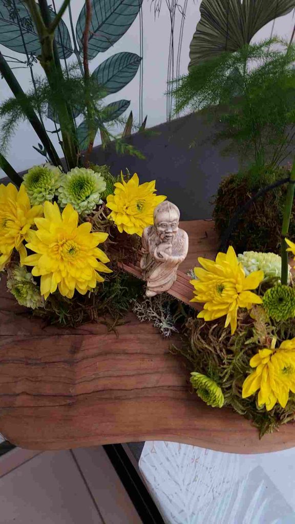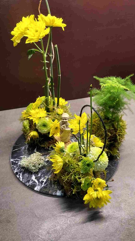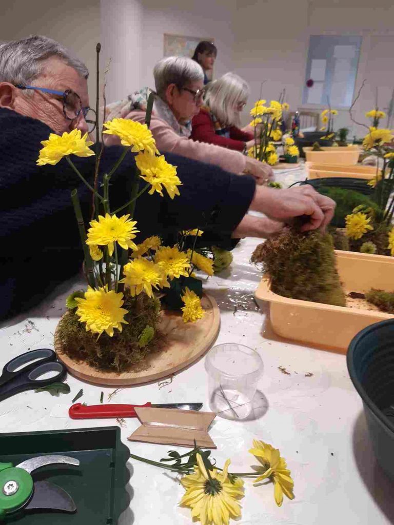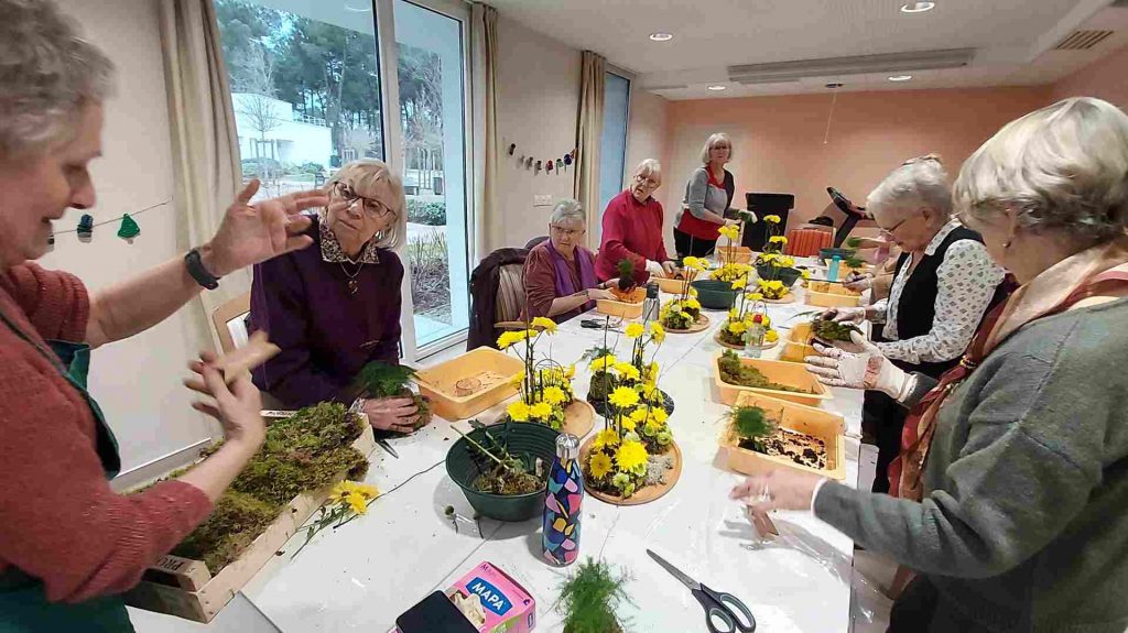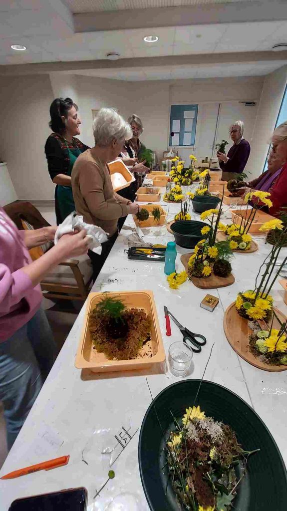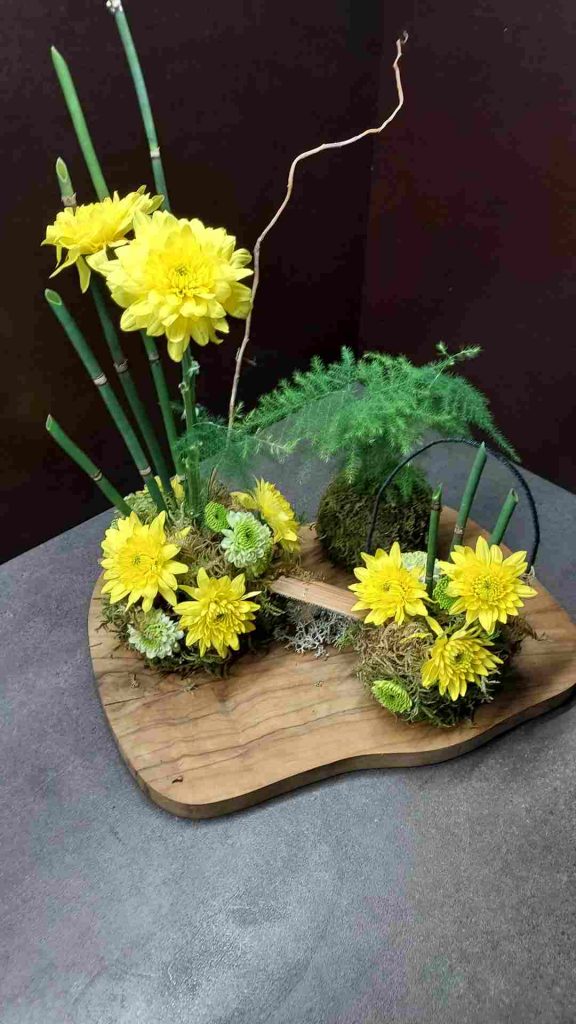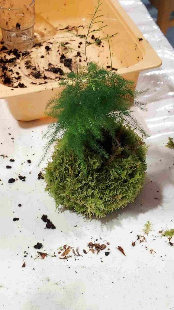 Ce dernier est moins orné, reflétant l’idée d’un futur encore à construire. Un petit pont relie les deux blocs, symbolisant la transition du passé vers l’avenir, le présent. Une citrine discrètement placée dans la composition renforce cette symbolique de passage et le renouveau. Pour clore l’atelier, les participantes ont réalisé un kokedama, une autre facette de l’art floral japonais. Une boule de terre enveloppée de mousse des bois accueille une plante, ici un asparagus. Le tout est maintenu par un maillage presque invisible en fil de nylon. L’atelier s’est déroulé dans une ambiance conviviale et créative, offrant à chacune l’occasion de découvrir et de pratiquer cet art délicat et chargé de sens.
