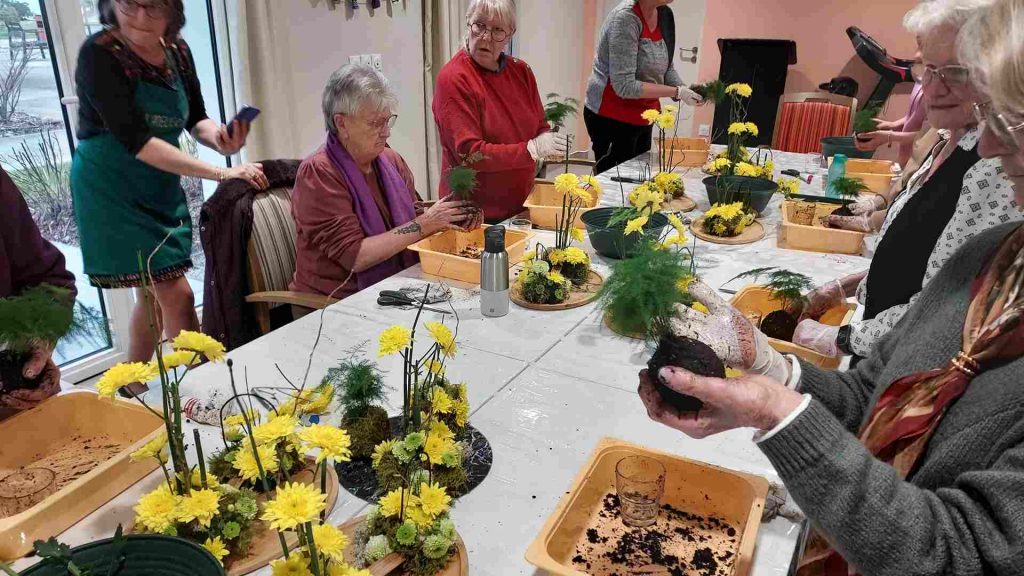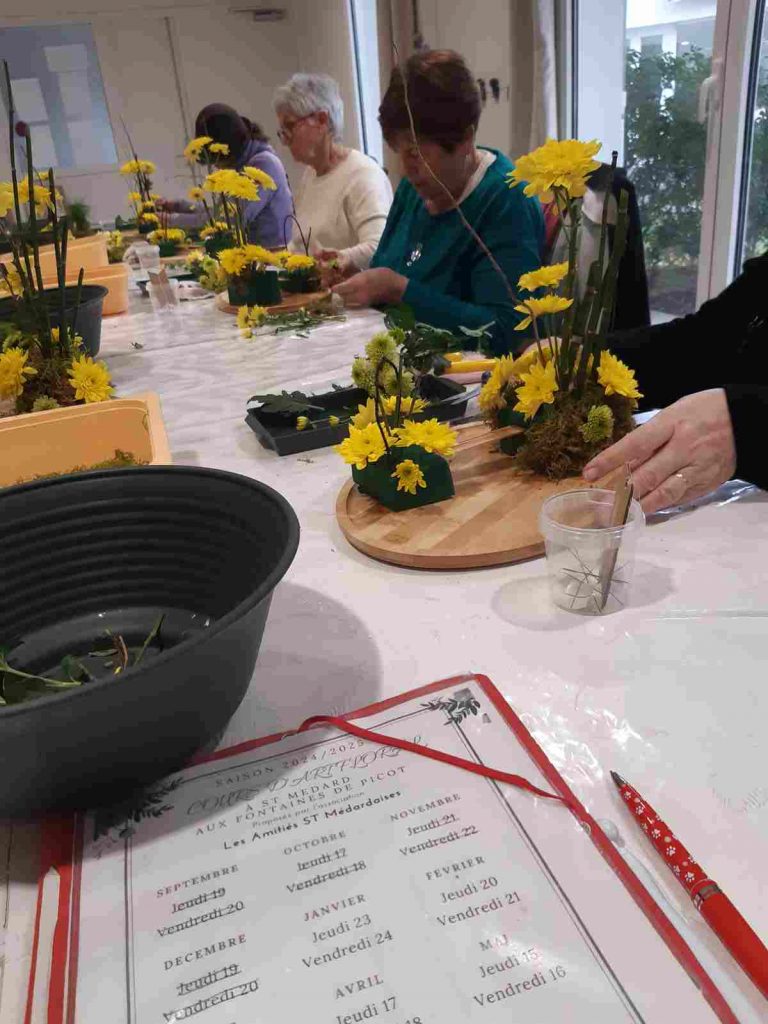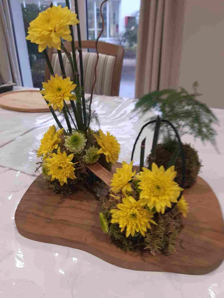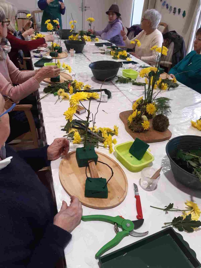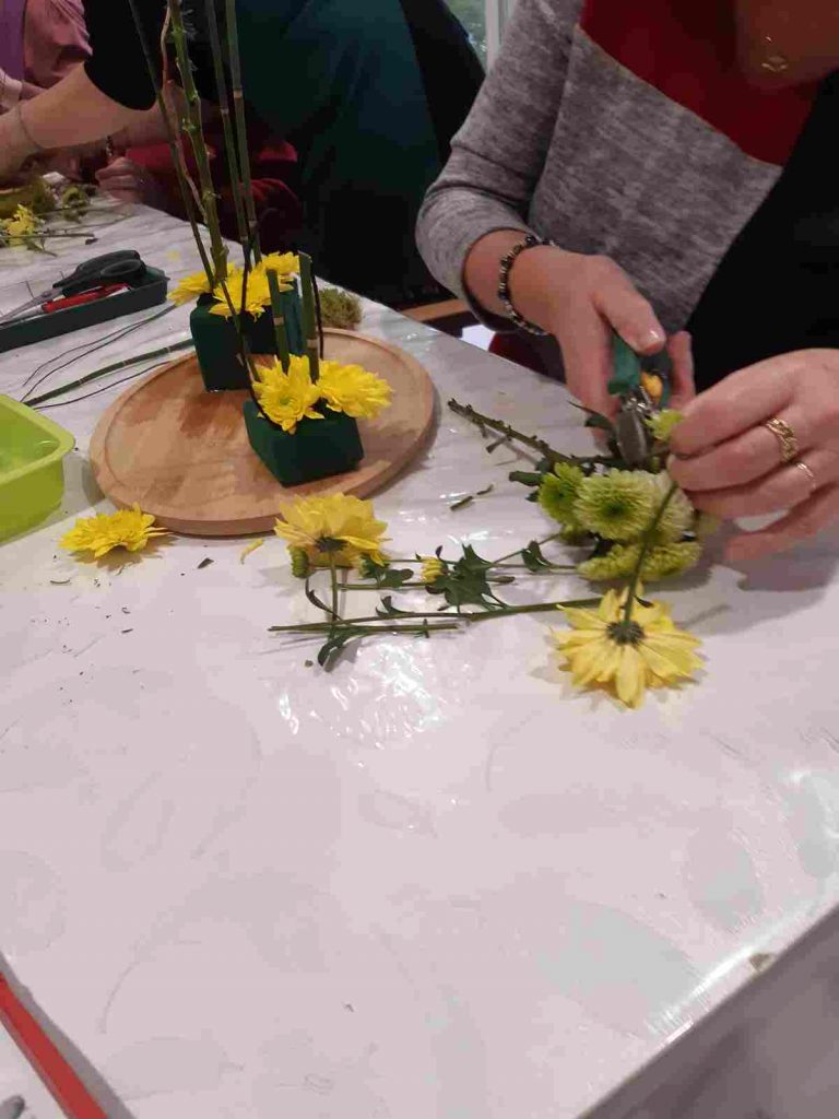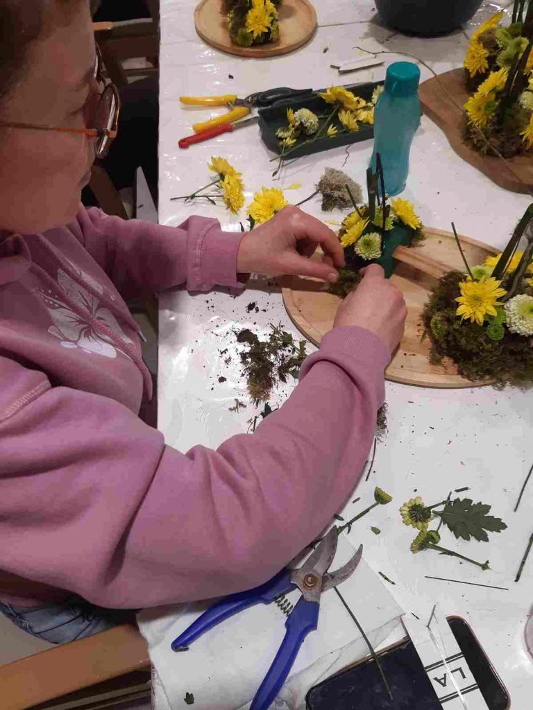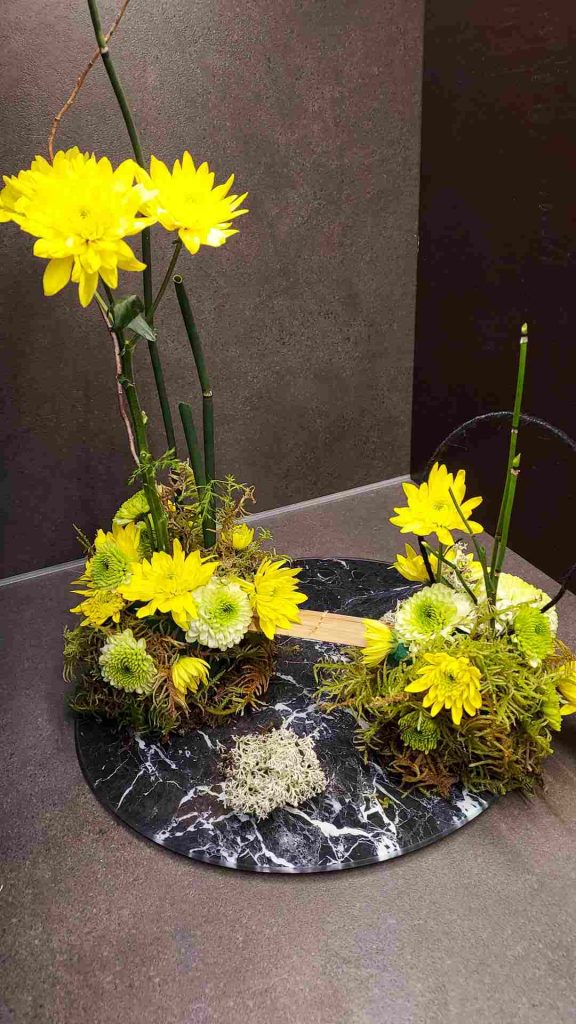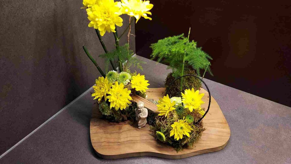 Ce dernier est moins orné, reflétant l’idée d’un futur encore à construire. Un petit pont relie les deux blocs, symbolisant la transition du passé vers l’avenir, le présent. Une citrine discrètement placée dans la composition renforce cette symbolique de passage et le renouveau. Pour clore l’atelier, les participantes ont réalisé un kokedama, une autre facette de l’art floral japonais. Une boule de terre enveloppée de mousse des bois accueille une plante, ici un asparagus. Le tout est maintenu par un maillage presque invisible en fil de nylon. L’atelier s’est déroulé dans une ambiance conviviale et créative, offrant à chacune l’occasion de découvrir et de pratiquer cet art délicat et chargé de sens.
