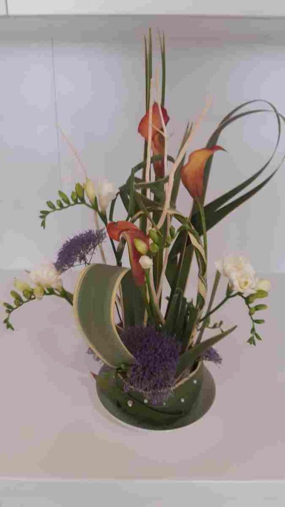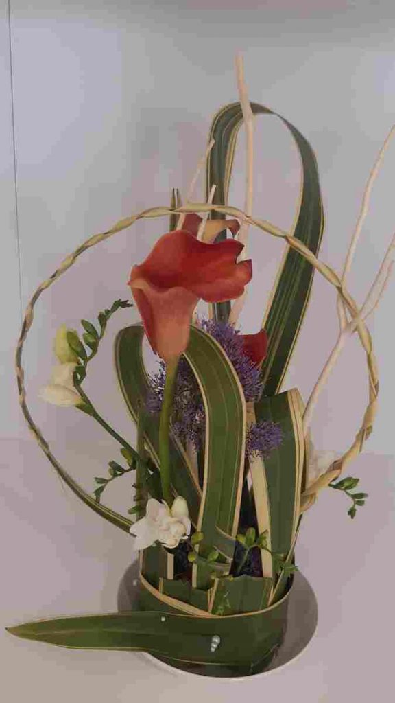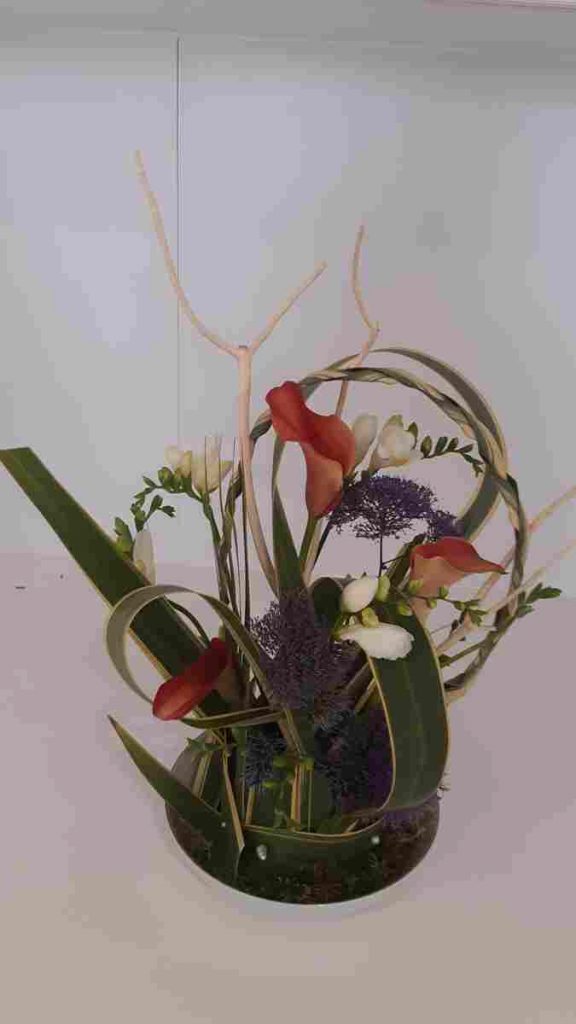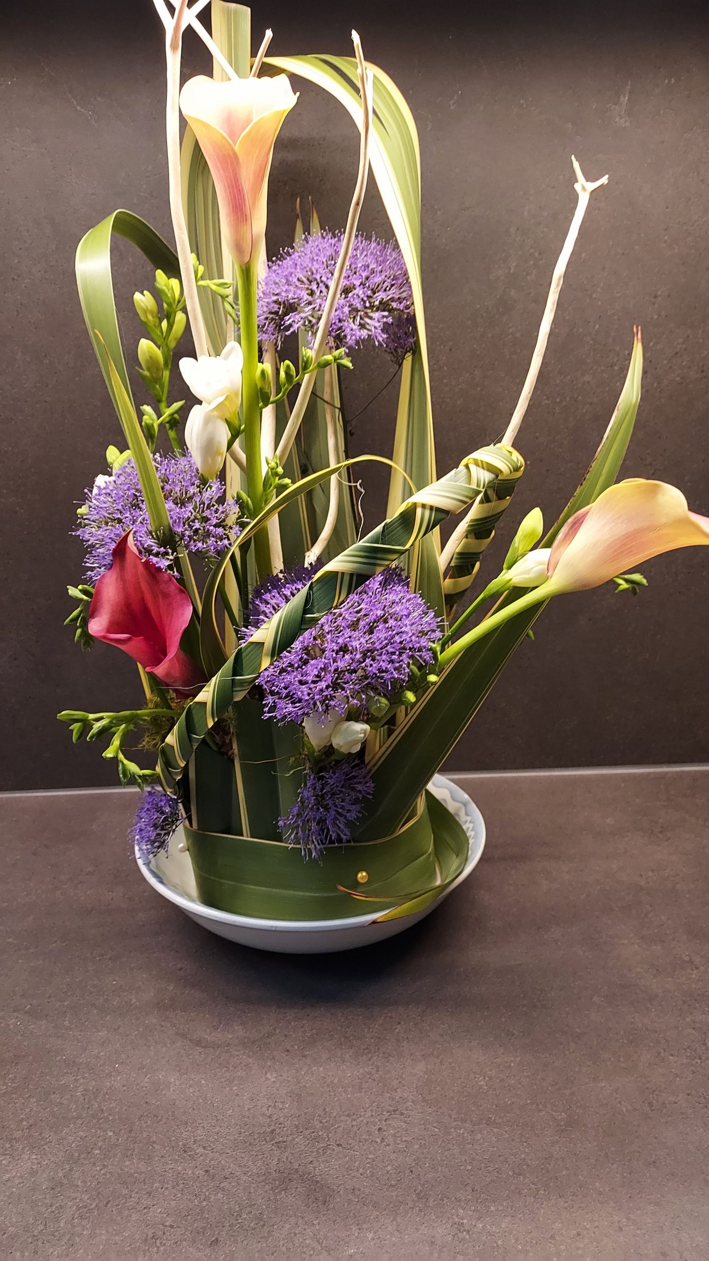 Réalisée dans un contenant bas, assurant stabilité et harmonie visuelle, la création repose sur une structure mêlant lignes verticales et courbes. L’ensemble évoque une esthétique contemporaine, où se marient élégance et originalité. Des callas aux teintes crème et rose pâle apportent hauteur et raffinement, tandis que les inflorescences de trachelium violet viennent densifier la composition par touches colorées et texturées. Quelques freesias blancs insufflent une sensation de fraîcheur et de légèreté. Le tout est structuré par un tressage précis de larges feuilles de Phormium qui dessinent volumes et mouvements. Pour accentuer l’aspect graphique, des branches de mitsumata blanches sont disposées à la verticale, renforçant l’élan sculptural de la composition.