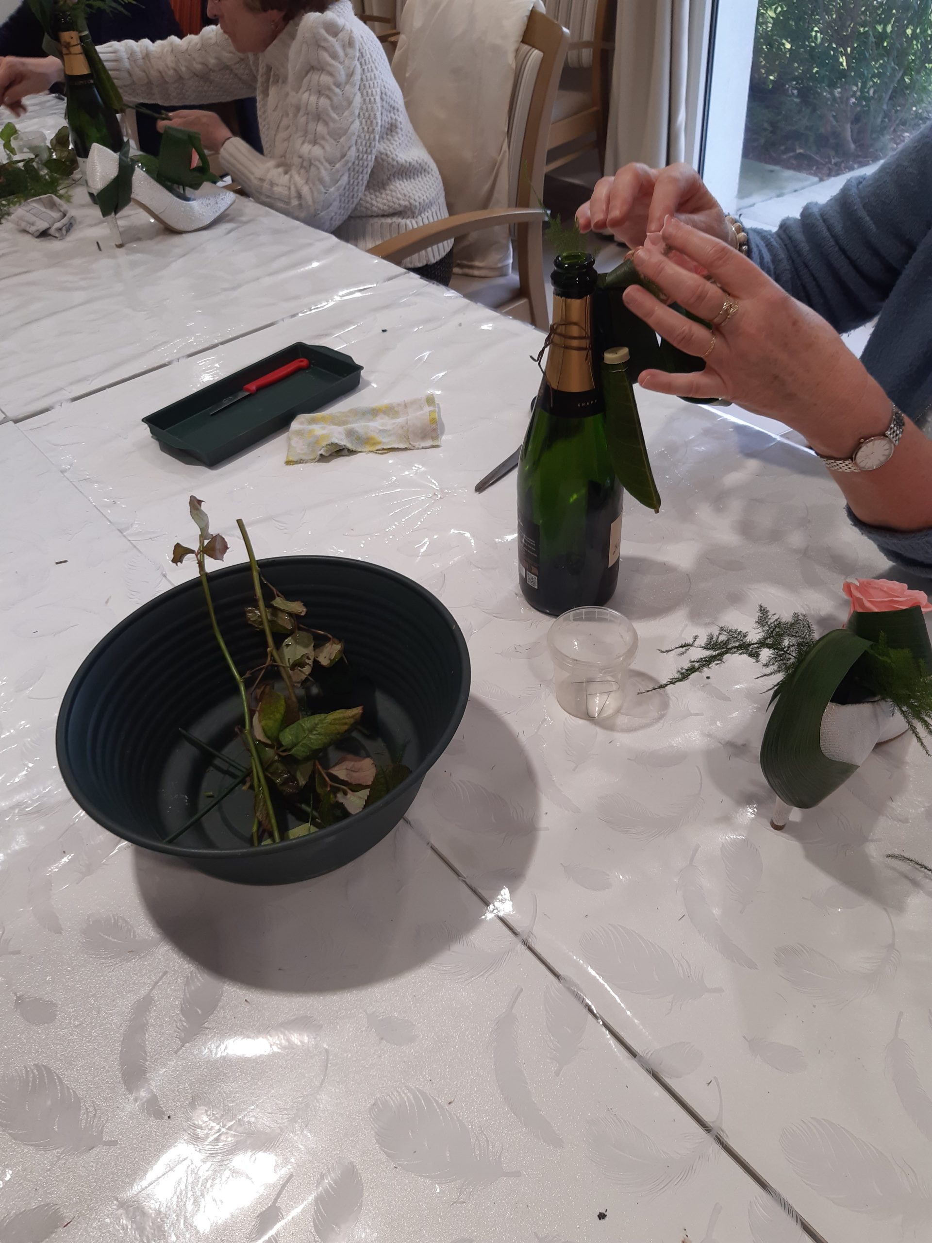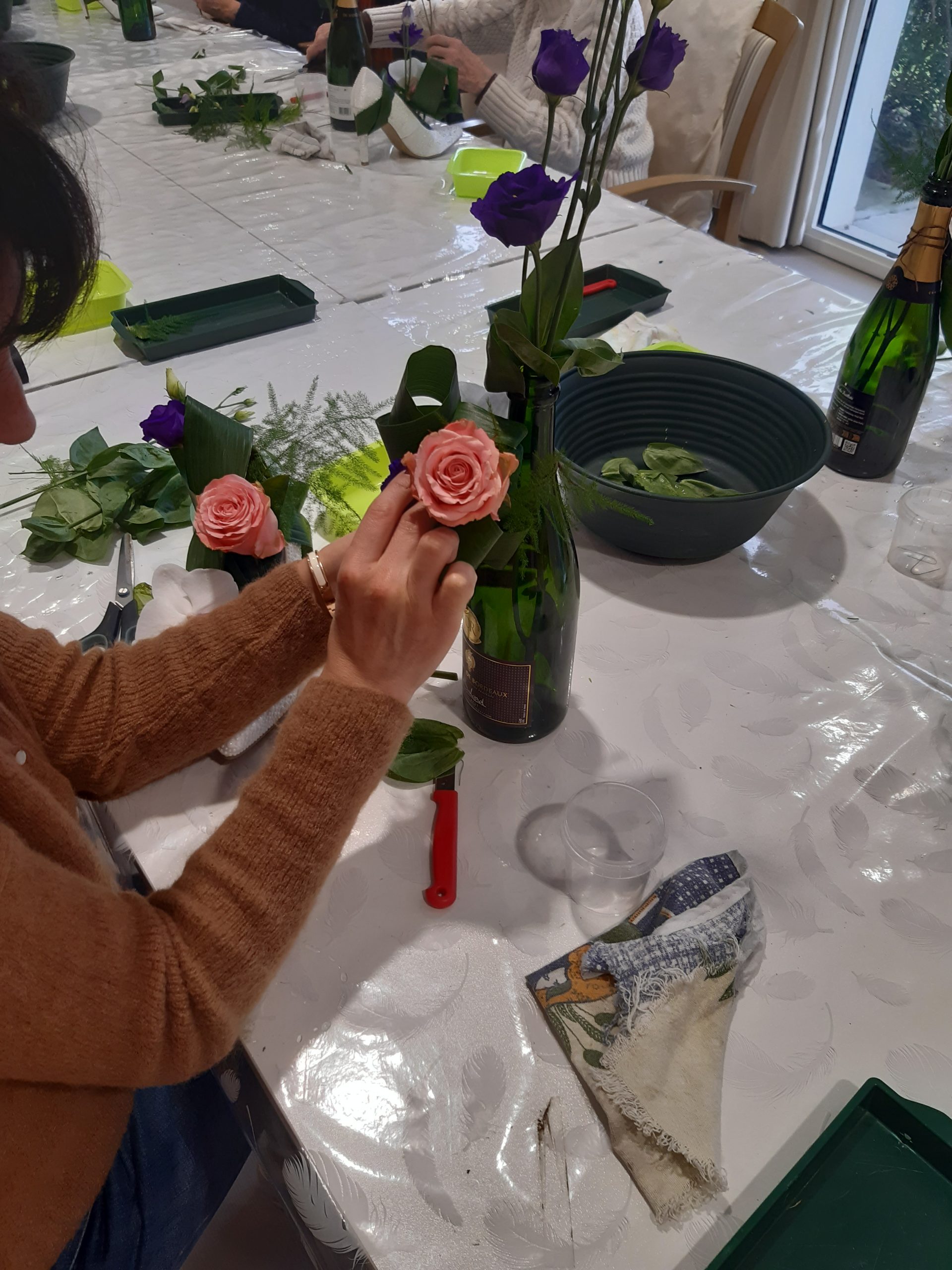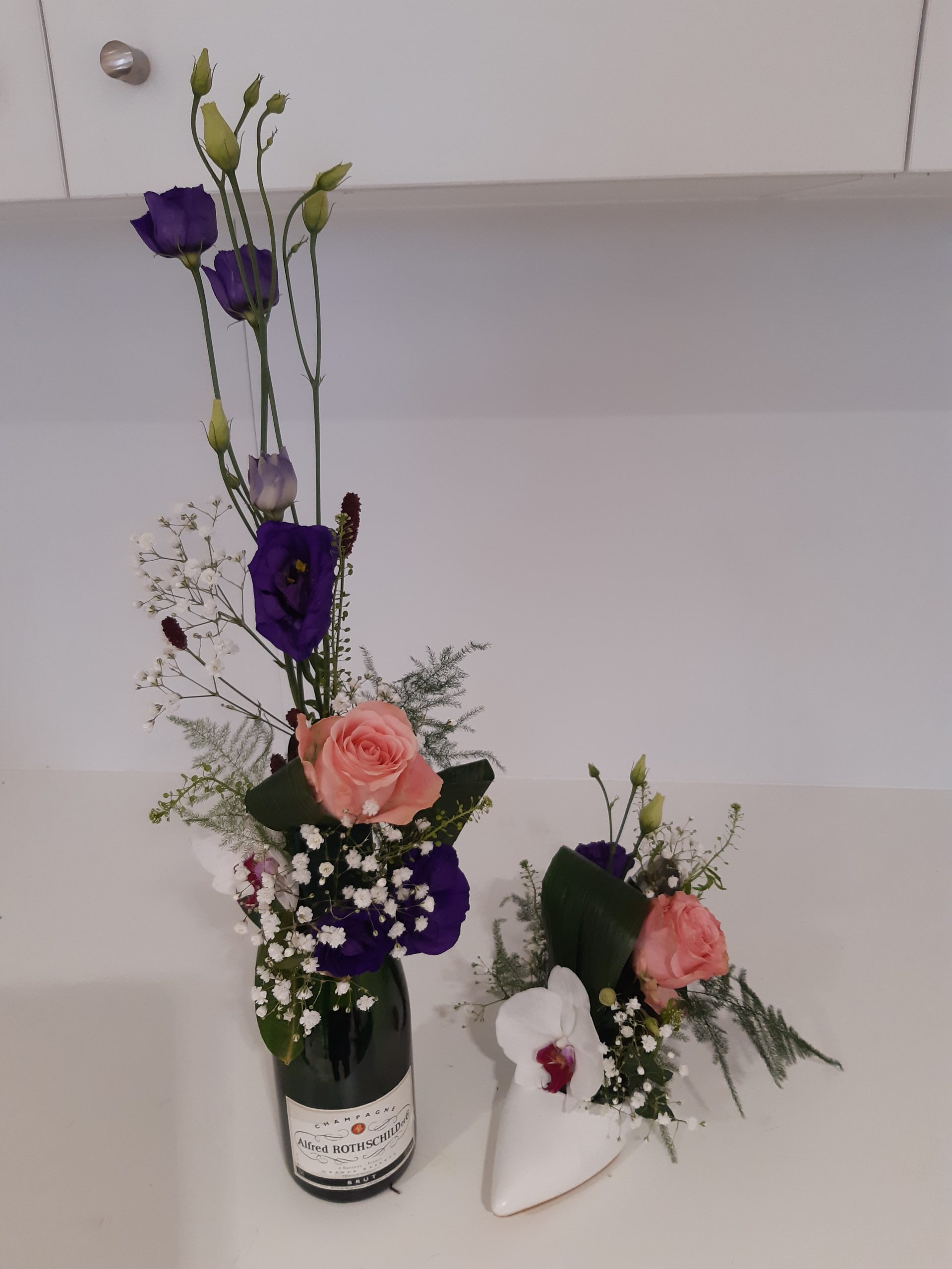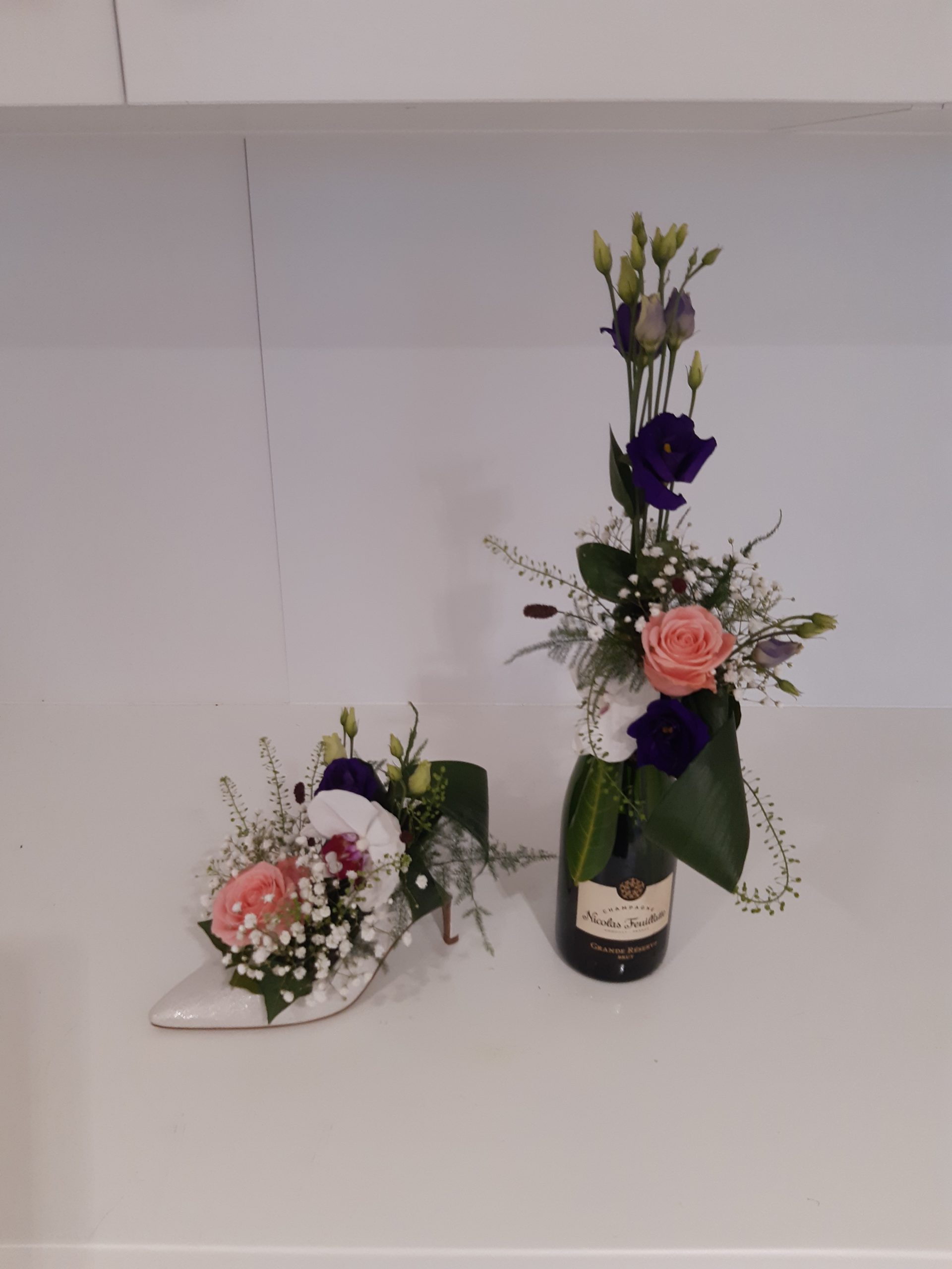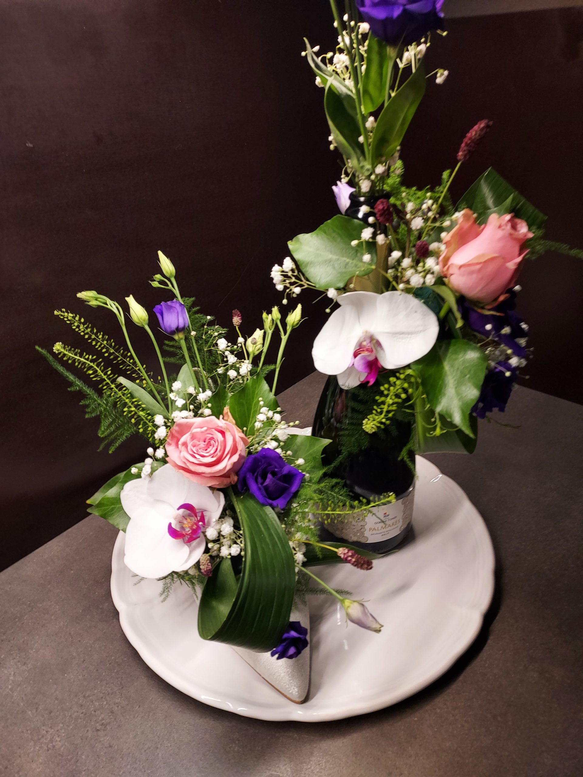 D’un côté, une simple bouteille devient soliflore. Sa silhouette sombre se transforme en support élégant pour une composition délicate : orchidées blanches aériennes, roses poudrées, lisianthus violets et fines touches de gypsophile. Les feuillages souples et les lignes élancées créent un mouvement naturel.
