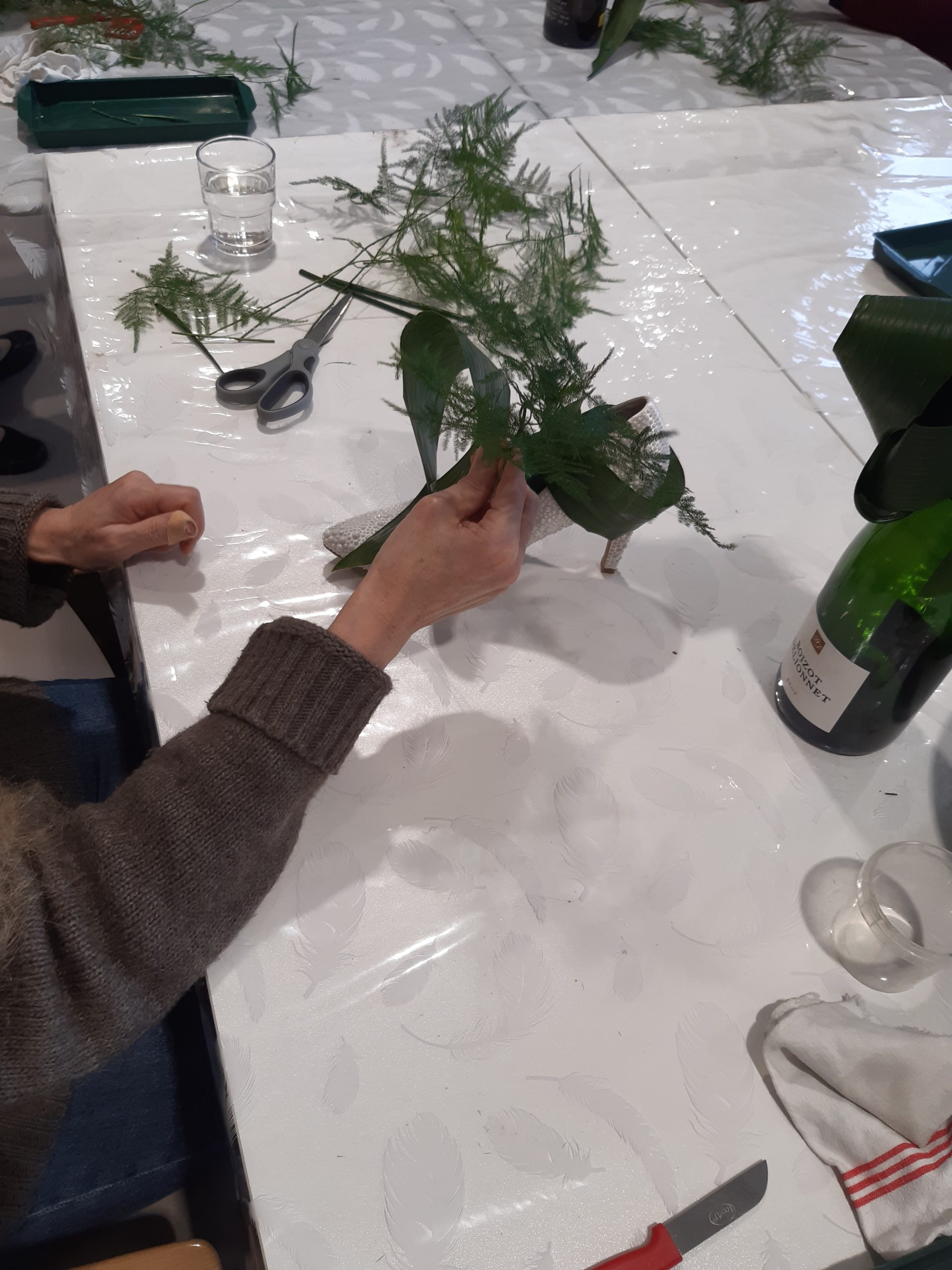 De l’autre, un escarpin oublié renaît en contenant et accueille un jardin miniature où se mêlent aussi des roses pastel, bourgeons de lisianthus, baies sauvages et textures végétales légères.