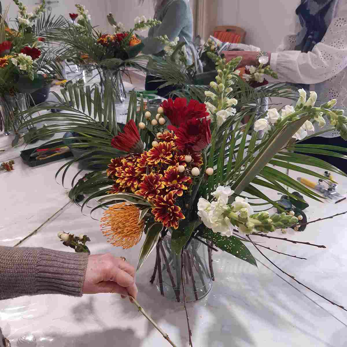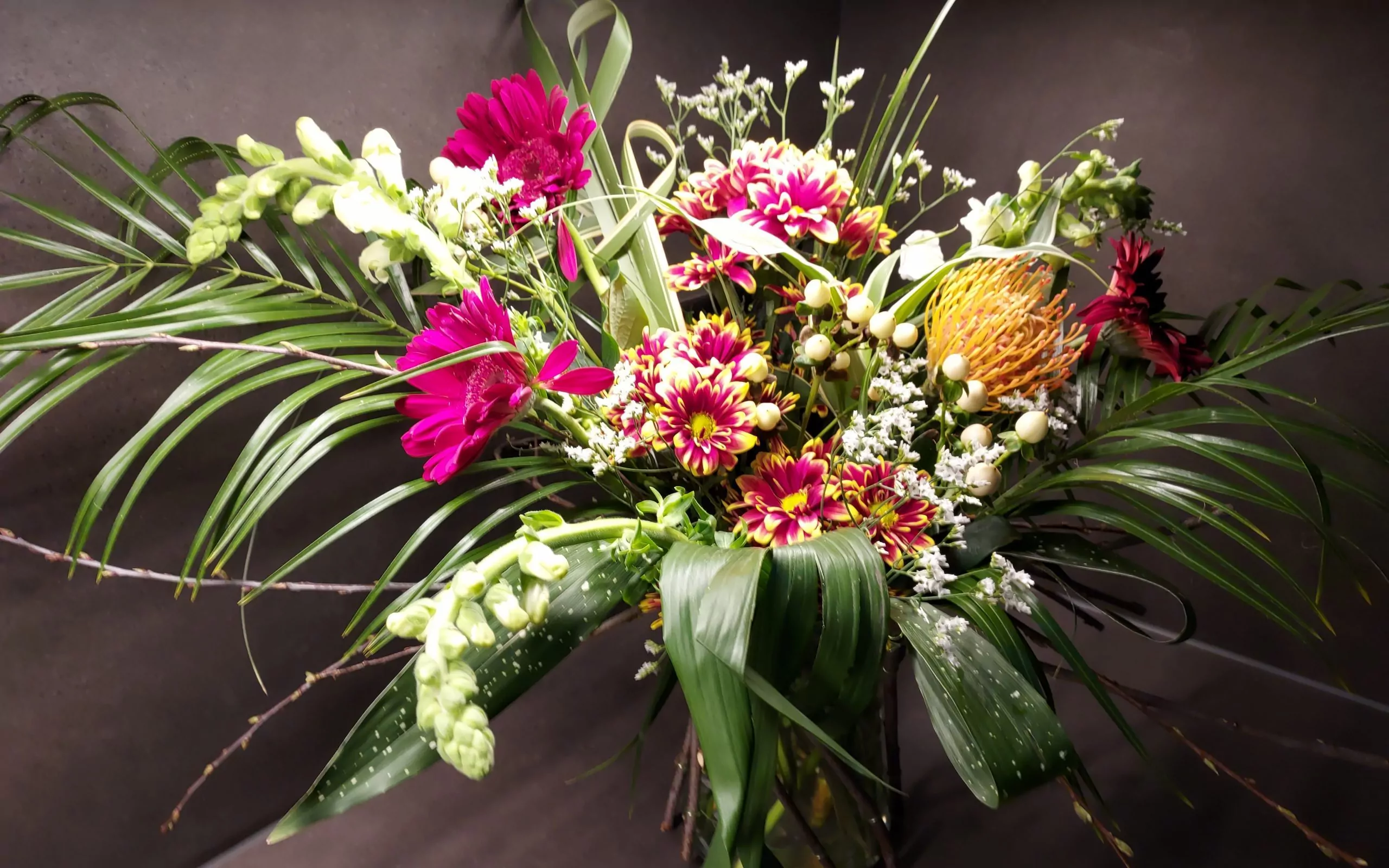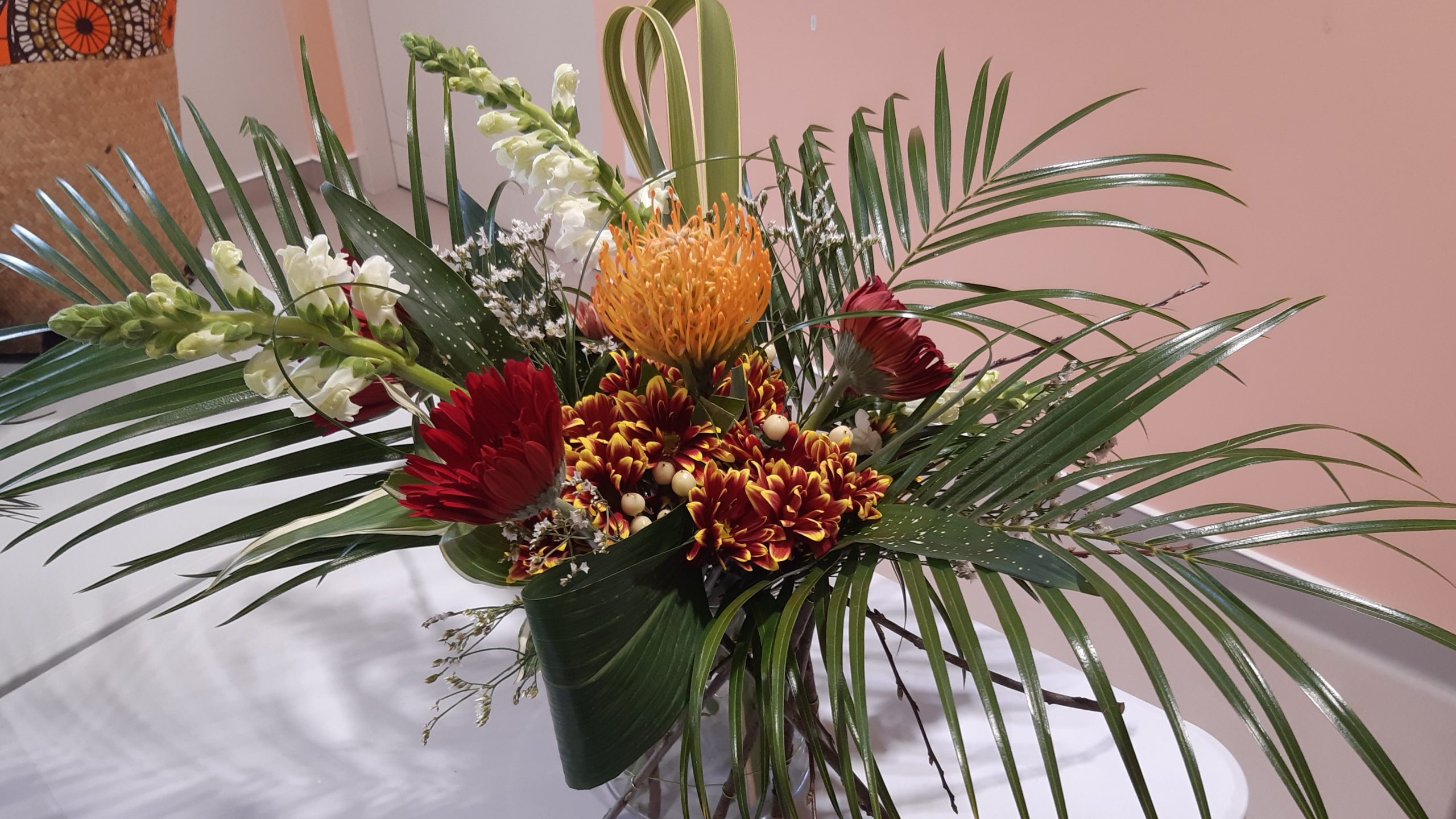 Les couleurs chaudes dominent l’ensemble : des germinis disposées de part et d’autre apportent éclat et intensité.