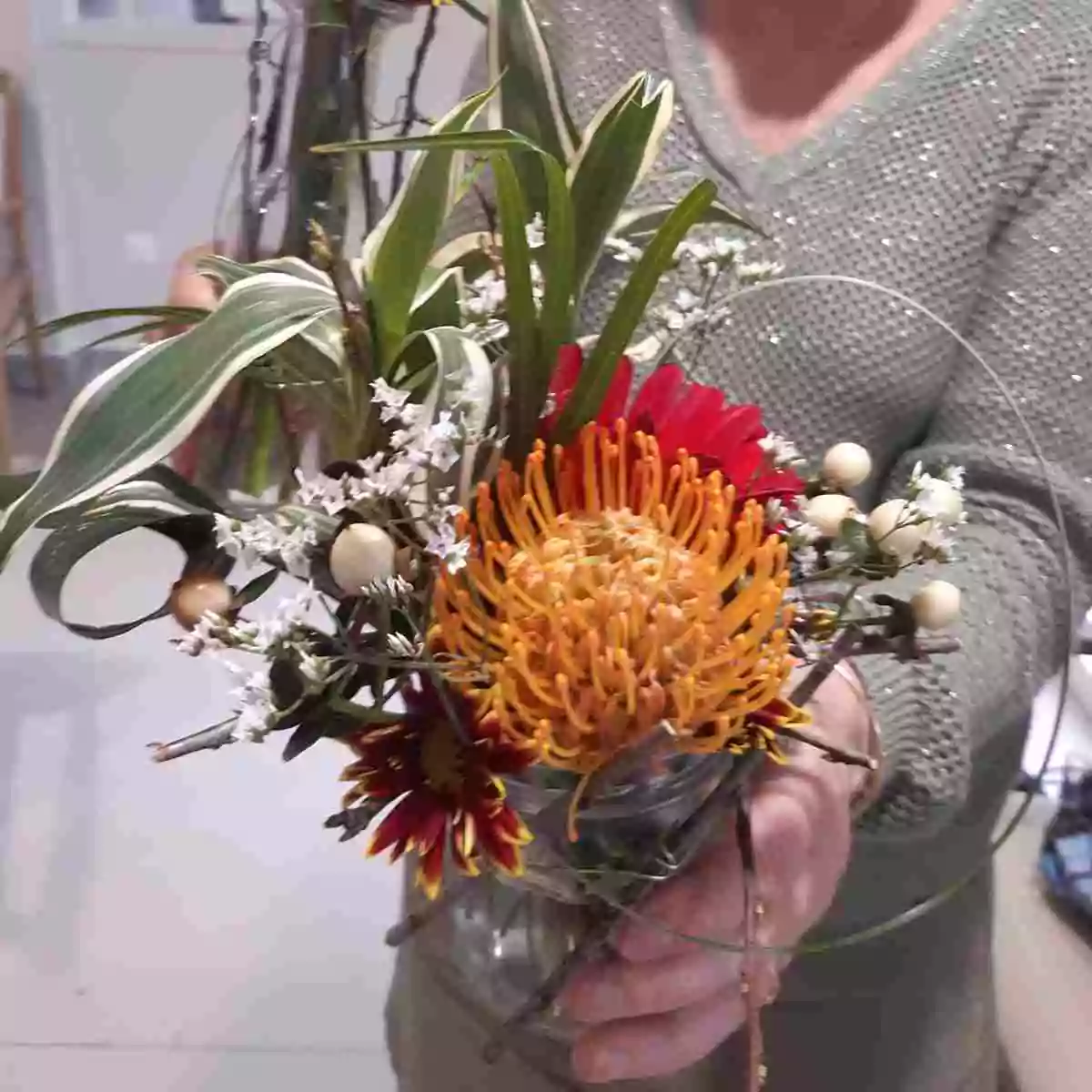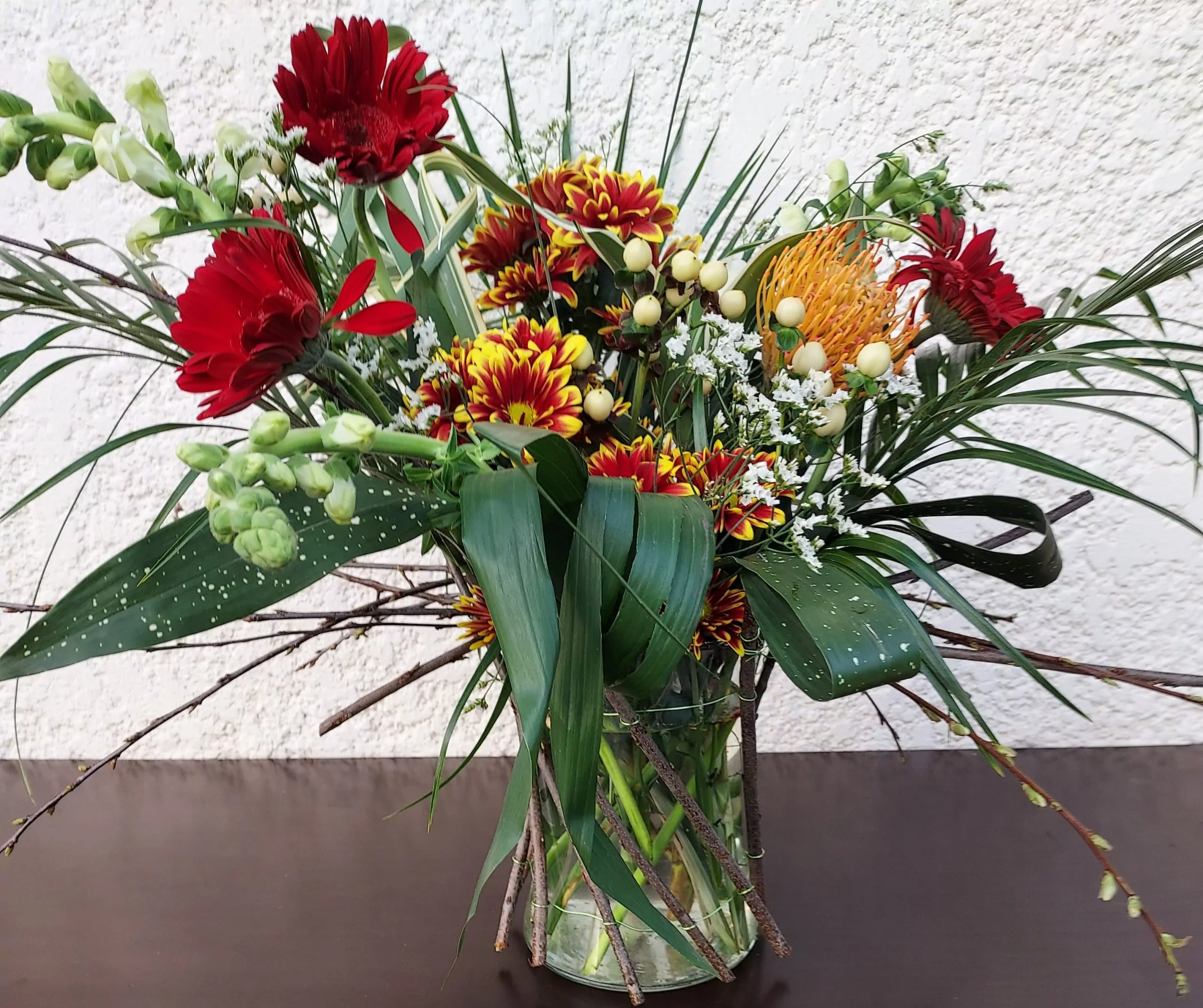 Au centre, des chrysanthèmes bicolores rouge et jaune créent un cœur lumineux. Une fleur orangée de protéa, véritable point focal de la composition, apporte une touche originale.