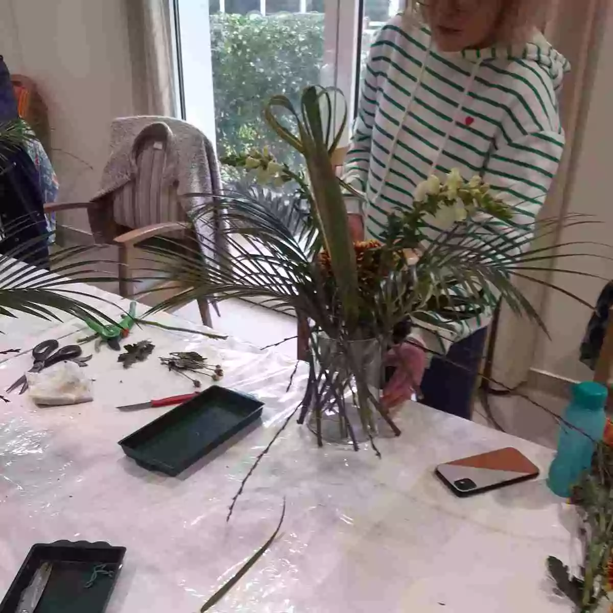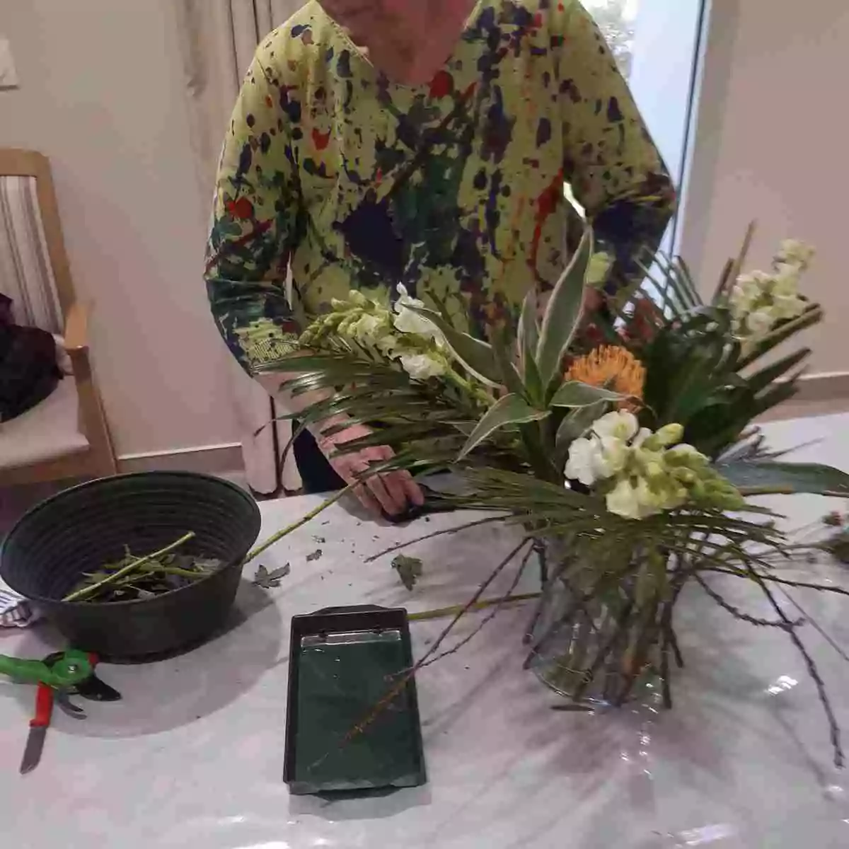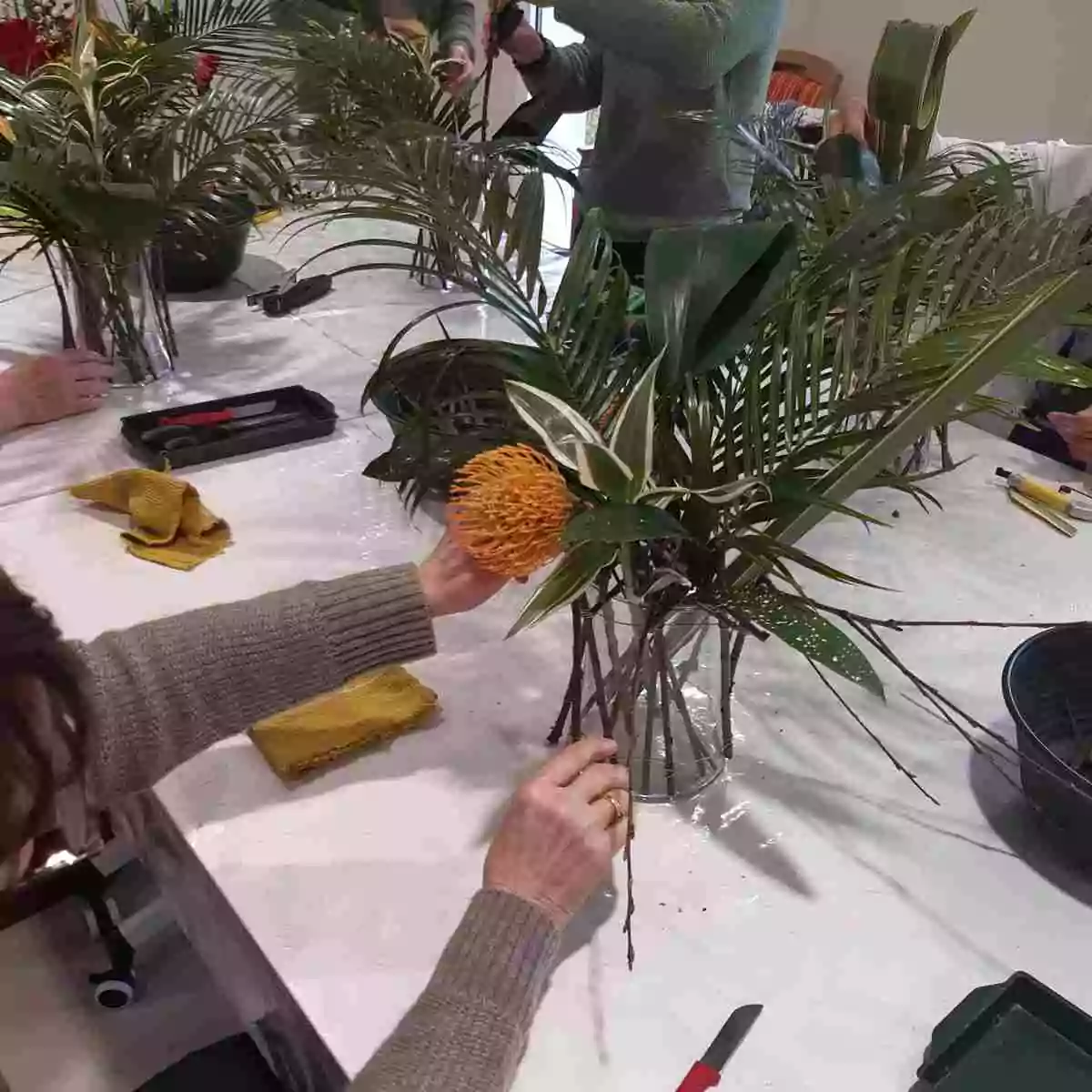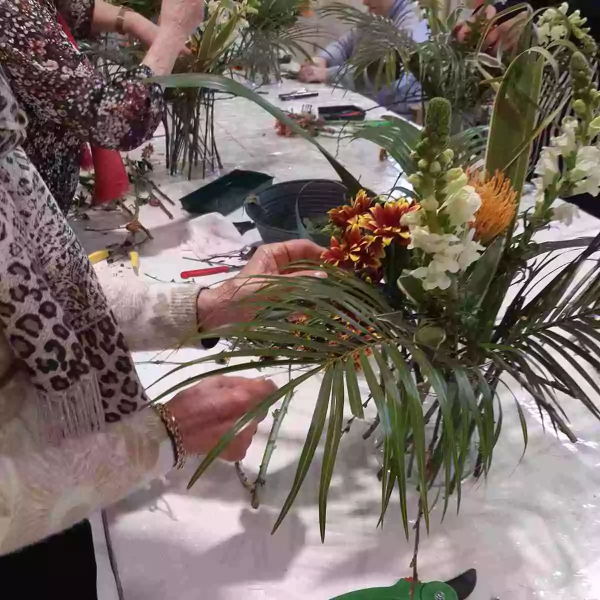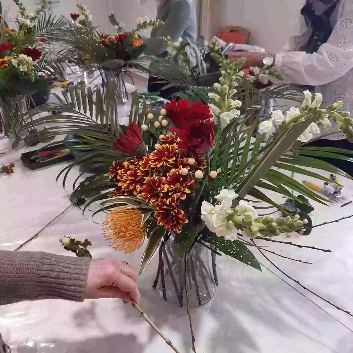 Un feuillage varié, composé de feuilles d’aspidistra via lactea, de phormium, de palmier robellini, de dracaena et de fines branches de cerisier sauvage, accompagné de quelques tiges de mufliers blancs, structure la composition, lui apporte du mouvement et un effet de légèreté.