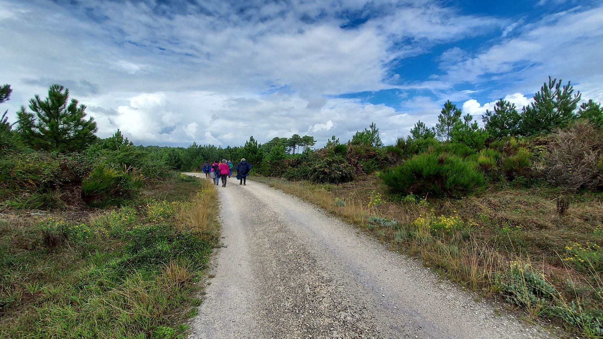 Ce samedi 21 octobre, 9 pèlerins ont bravé les intempéries au Grand Crohot *à Lège. Météo France nous assurait le matin d’une journée assez bien ventée mais sèche jusqu’en soirée. Le vent effectivement n’a pas manqué mais il n’était pas ressenti en forêt. Quant à la pluie, cette dernière nous a souhaité la bienvenue durant 5 à 10 minutes au départ de notre marche en forêt le matin puis très brièvement juste avant de mettre les nappes pour la pause casse-croute. Ensuite RAS jusqu’à ce que nous atteignons l’océan en début d’après-midi. Ce fut alors 5 km de plage parcourus par une petite brise, avec des rafales 50km/h de trois quarts, laquelle accompagnée d’une pluie fine intermittente nous cinglait le visage avant le retour en forêt avec soleil et ciel bleu. Sur la plage pas grand monde si ce n’est une patrouille de la gendarmerie maritime, et un groupe de marcheuses que nous avons croisé et un bon nombre d’adeptes du kitesurf très agréables à voir pratiquer qui s’en donnaient à cœur joie.