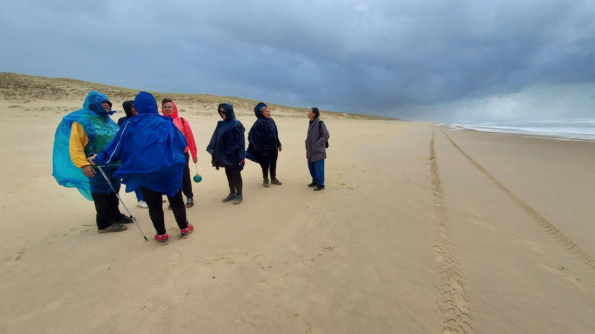 Ce samedi 21 octobre, 9 pèlerins ont bravé les intempéries au Grand Crohot *à Lège. Météo France nous assurait le matin d’une journée assez bien ventée mais sèche jusqu’en soirée. Le vent effectivement n’a pas manqué mais il n’était pas ressenti en forêt. Quant à la pluie, cette dernière nous a souhaité la bienvenue durant 5 à 10 minutes au départ de notre marche en forêt le matin puis très brièvement juste avant de mettre les nappes pour la pause casse-croute. Ensuite RAS jusqu’à ce que nous atteignons l’océan en début d’après-midi. Ce fut alors 5 km de plage parcourus par une petite brise, avec des rafales 50km/h de trois quarts, laquelle accompagnée d’une pluie fine intermittente nous cinglait le visage avant le retour en forêt avec soleil et ciel bleu. Sur la plage pas grand monde si ce n’est une patrouille de la gendarmerie maritime, et un groupe de marcheuses que nous avons croisé et un bon nombre d’adeptes du kitesurf très agréables à voir pratiquer qui s’en donnaient à cœur joie.