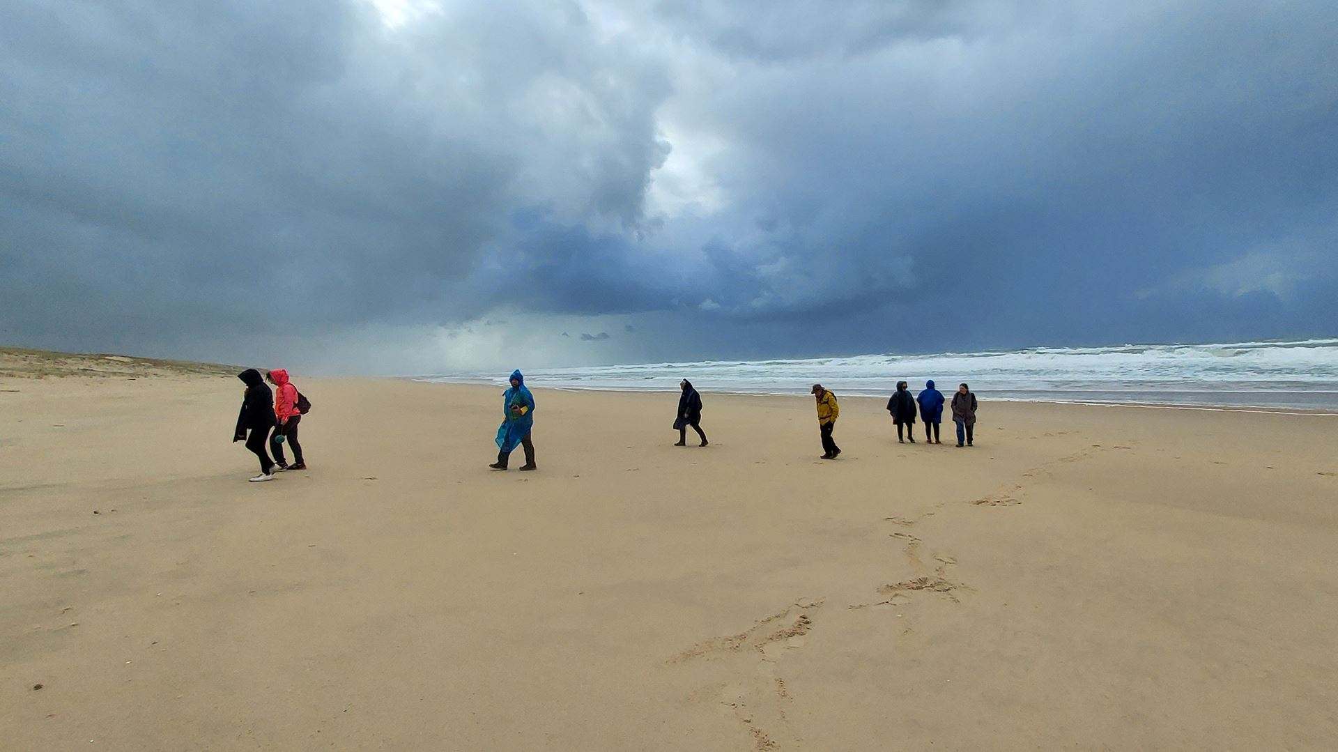 Ce samedi 21 octobre, 9 pèlerins ont bravé les intempéries au Grand Crohot *à Lège. Météo France nous assurait le matin d’une journée assez bien ventée mais sèche jusqu’en soirée. Le vent effectivement n’a pas manqué mais il n’était pas ressenti en forêt. Quant à la pluie, cette dernière nous a souhaité la bienvenue durant 5 à 10 minutes au départ de notre marche en forêt le matin puis très brièvement juste avant de mettre les nappes pour la pause casse-croute. Ensuite RAS jusqu’à ce que nous atteignons l’océan en début d’après-midi. Ce fut alors 5 km de plage parcourus par une petite brise, avec des rafales 50km/h de trois quarts, laquelle accompagnée d’une pluie fine intermittente nous cinglait le visage avant le retour en forêt avec soleil et ciel bleu. Sur la plage pas grand monde si ce n’est une patrouille de la gendarmerie maritime, et un groupe de marcheuses que nous avons croisé et un bon nombre d’adeptes du kitesurf très agréables à voir pratiquer qui s’en donnaient à cœur joie.