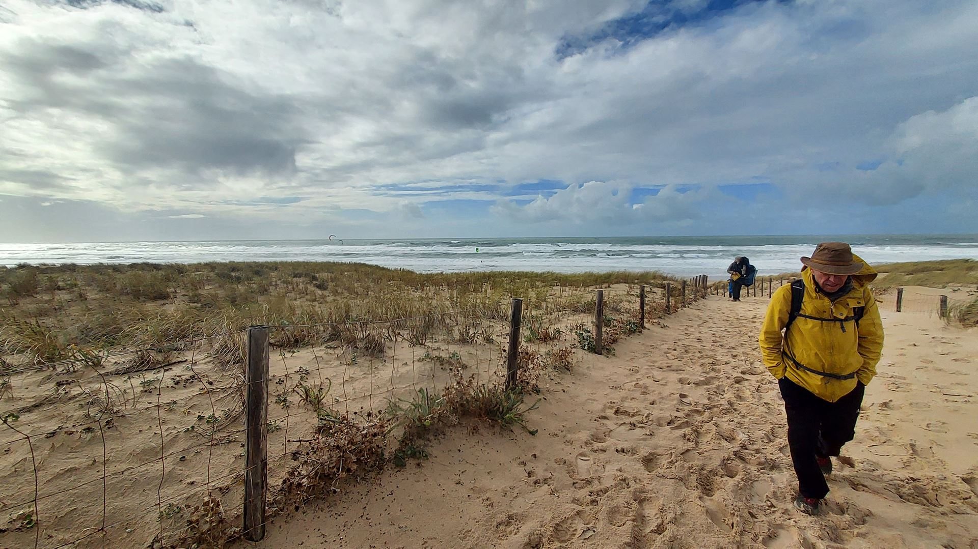 Ce samedi 21 octobre, 9 pèlerins ont bravé les intempéries au Grand Crohot *à Lège. Météo France nous assurait le matin d’une journée assez bien ventée mais sèche jusqu’en soirée. Le vent effectivement n’a pas manqué mais il n’était pas ressenti en forêt. Quant à la pluie, cette dernière nous a souhaité la bienvenue durant 5 à 10 minutes au départ de notre marche en forêt le matin puis très brièvement juste avant de mettre les nappes pour la pause casse-croute. Ensuite RAS jusqu’à ce que nous atteignons l’océan en début d’après-midi. Ce fut alors 5 km de plage parcourus par une petite brise, avec des rafales 50km/h de trois quarts, laquelle accompagnée d’une pluie fine intermittente nous cinglait le visage avant le retour en forêt avec soleil et ciel bleu. Sur la plage pas grand monde si ce n’est une patrouille de la gendarmerie maritime, et un groupe de marcheuses que nous avons croisé et un bon nombre d’adeptes du kitesurf très agréables à voir pratiquer qui s’en donnaient à cœur joie.