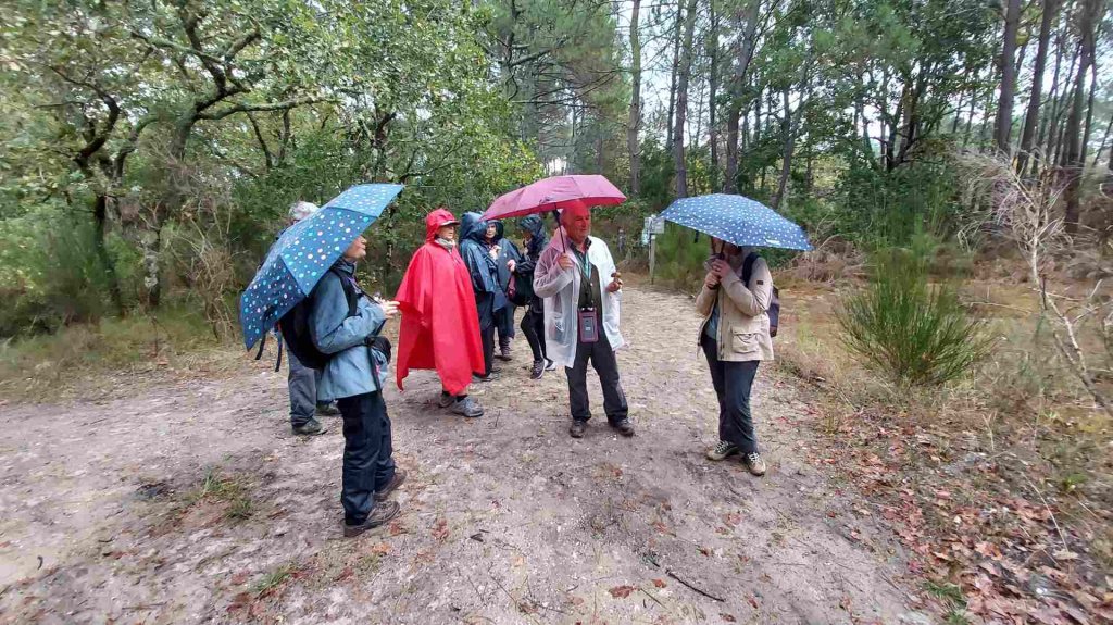 Ce samedi 21 septembre, 14 marcheurs ont bravé les intempéries annoncées, pluies et orages lors de notre sortie du côté d’Arès 17 à 18 km au total. Le matin, sous un ciel simplement nuageux, nous avons randonné à travers les prés salés d’Arès. L’après-midi, sous le soleil, ce fût, le long du bassin, direction Andernos pour une dégustation de glace par les gourmands. Ponchos et parapluies étaient restés jusque-là dans les sacs, mais lors de notre retour par la forêt, juste avant d’atteindre notre parking, un violent orage nous a copieusement arrosé durant une bonne vingtaine de minutes avant le retour du soleil, sans pour autant gacher notre bonne humeur !