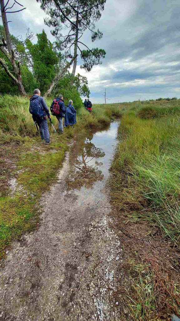 Ce samedi 21 septembre, 14 marcheurs ont bravé les intempéries annoncées, pluies et orages lors de notre sortie du côté d’Arès 17 à 18 km au total. Le matin, sous un ciel simplement nuageux, nous avons randonné à travers les prés salés d’Arès. L’après-midi, sous le soleil, ce fût, le long du bassin, direction Andernos pour une dégustation de glace par les gourmands. Ponchos et parapluies étaient restés jusque-là dans les sacs, mais lors de notre retour par la forêt, juste avant d’atteindre notre parking, un violent orage nous a copieusement arrosé durant une bonne vingtaine de minutes avant le retour du soleil, sans pour autant gacher notre bonne humeur !