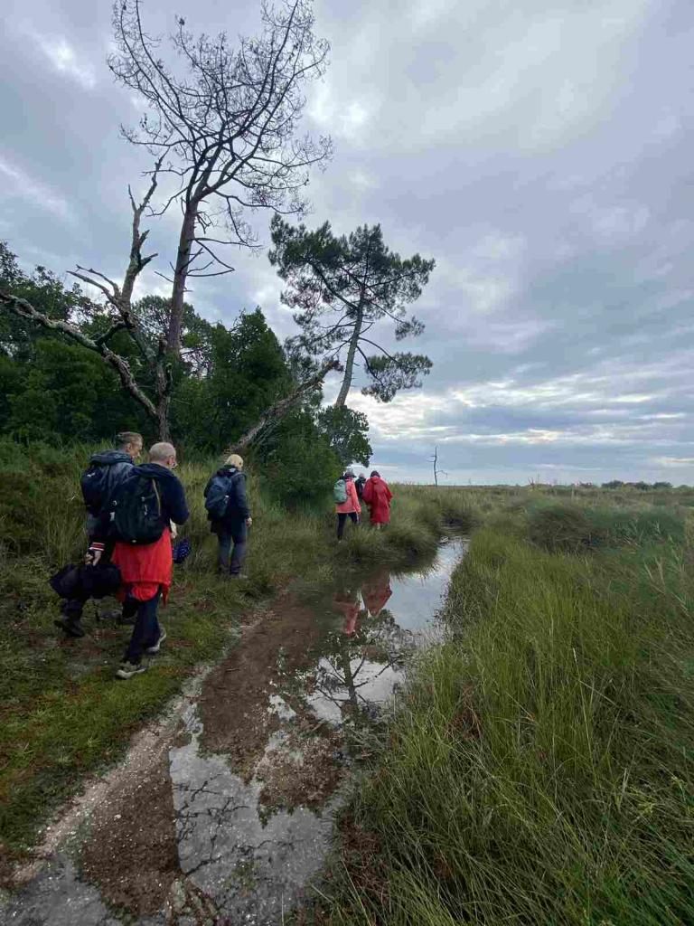 Ce samedi 21 septembre, 14 marcheurs ont bravé les intempéries annoncées, pluies et orages lors de notre sortie du côté d’Arès 17 à 18 km au total. Le matin, sous un ciel simplement nuageux, nous avons randonné à travers les prés salés d’Arès. L’après-midi, sous le soleil, ce fût, le long du bassin, direction Andernos pour une dégustation de glace par les gourmands. Ponchos et parapluies étaient restés jusque-là dans les sacs, mais lors de notre retour par la forêt, juste avant d’atteindre notre parking, un violent orage nous a copieusement arrosé durant une bonne vingtaine de minutes avant le retour du soleil, sans pour autant gacher notre bonne humeur !