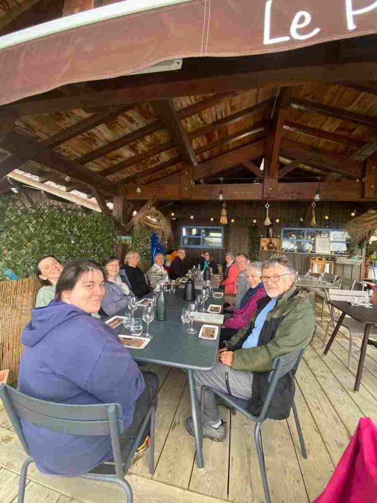A travers la forêt, la randonnée du matin nous a mené au village ostréicole de L’Herbe, où nous étions attendus à la « Cabane du Ponton » pour une dégustation huîtres, crevettes bulots, pâtés et vin blanc au bord du bassin. Après cette dégustation sous abri, mais accompagnée d’une bonne pluie, nous avons rejoint notre parking pour la poursuite de notre pause casse-croute avec café desserts.