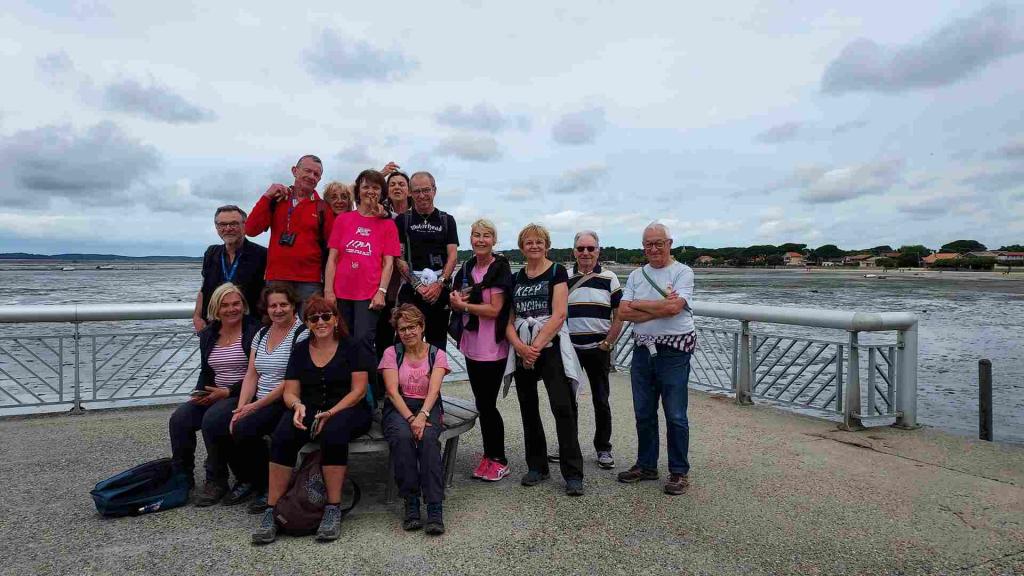 Par une journée de fin de printemps avec une météo peu encourageante… Un groupe de 18 marcheurs s’est lancé dans une aventure reliant Ares à Andernos. L’excursion a débuté à Arès au lieu dit St Brice, en empruntant le chemin du littoral qui serpente jusqu’au port ostréicole d’Andernos. Le groupe a ensuite atteint la jetée, où ils ont pu observer le paysage du bassin à marée basse. Pour le trajet retour, nous sommes passés par le boulevard de la plage, l’Église Saint-Éloi et les vestiges romains, puis traverser la forêt de Coulin, ou nous avons rencontré quelques beaux spécimens de chêne. Puis en longeant le ruisseau du Cires, nous avons apprécié un véritable écrin de nature sauvage. De retour à nos voitures, nous bouclons ainsi un parcours de 7,4 km, où un pique-nique convivial nous attendait. Quelques gouttes de pluie s’invitent en fin de repas… Pour les plus motivés, la marche s’est prolongée par une promenade digestive de 4 km pour finir jusqu’à la grande jetée, la tour et l’ OVNI-port. Sous un ciel nuageux, les gouttes de pluie ont laissé place à des rayons de soleil, rappelant que l’été était proche. Ce fut une journée agréable, à l’image de nos précédentes sorties. Merci à tous les participants pour ces moments, et à bientôt en septembre pour de nouvelles aventures !