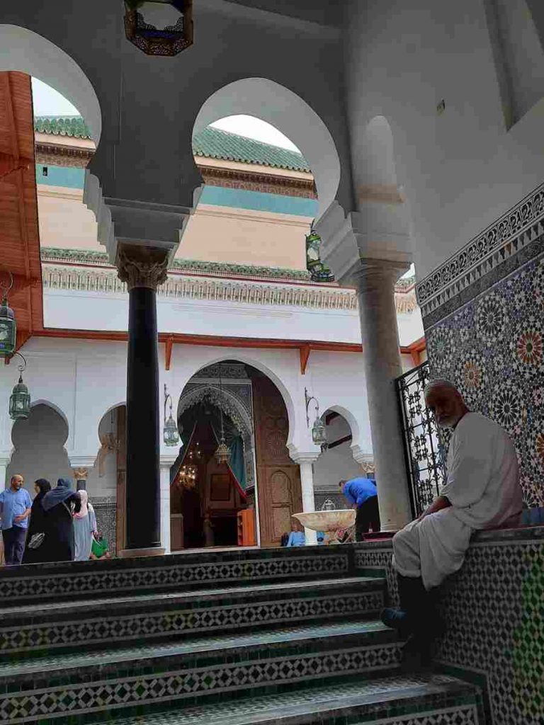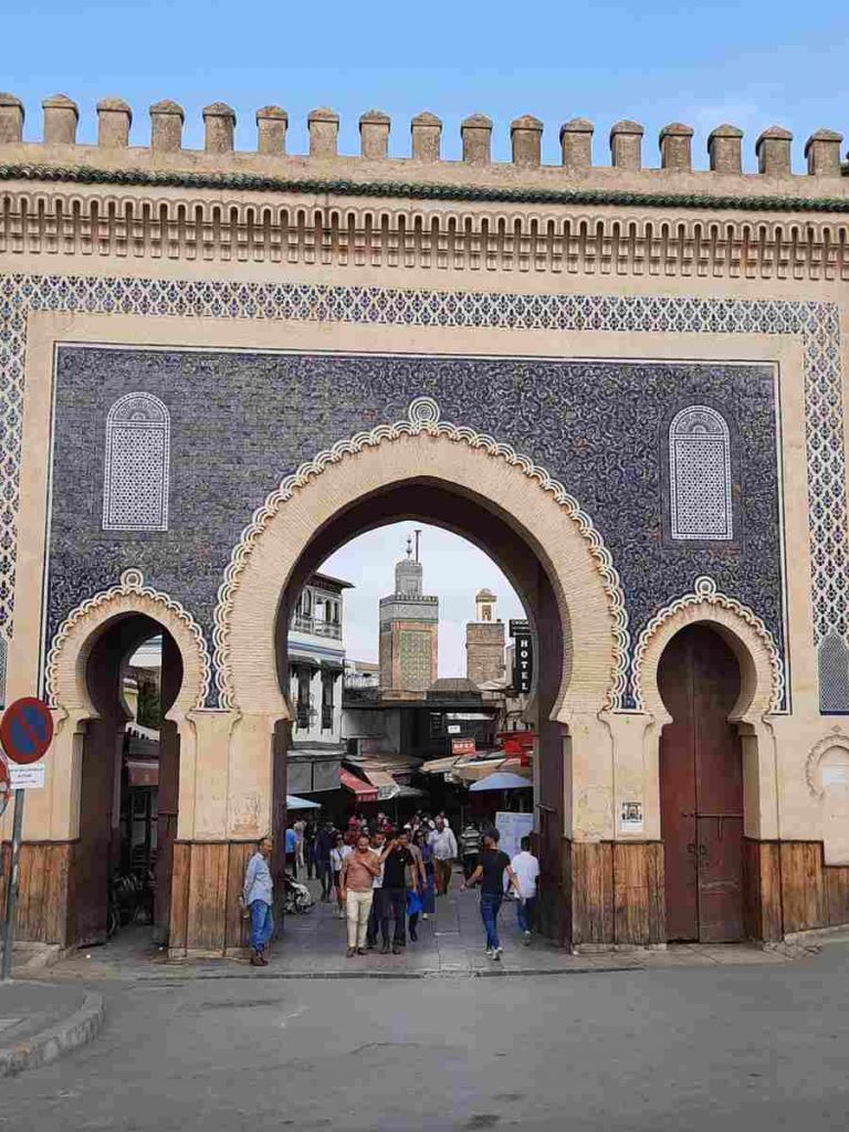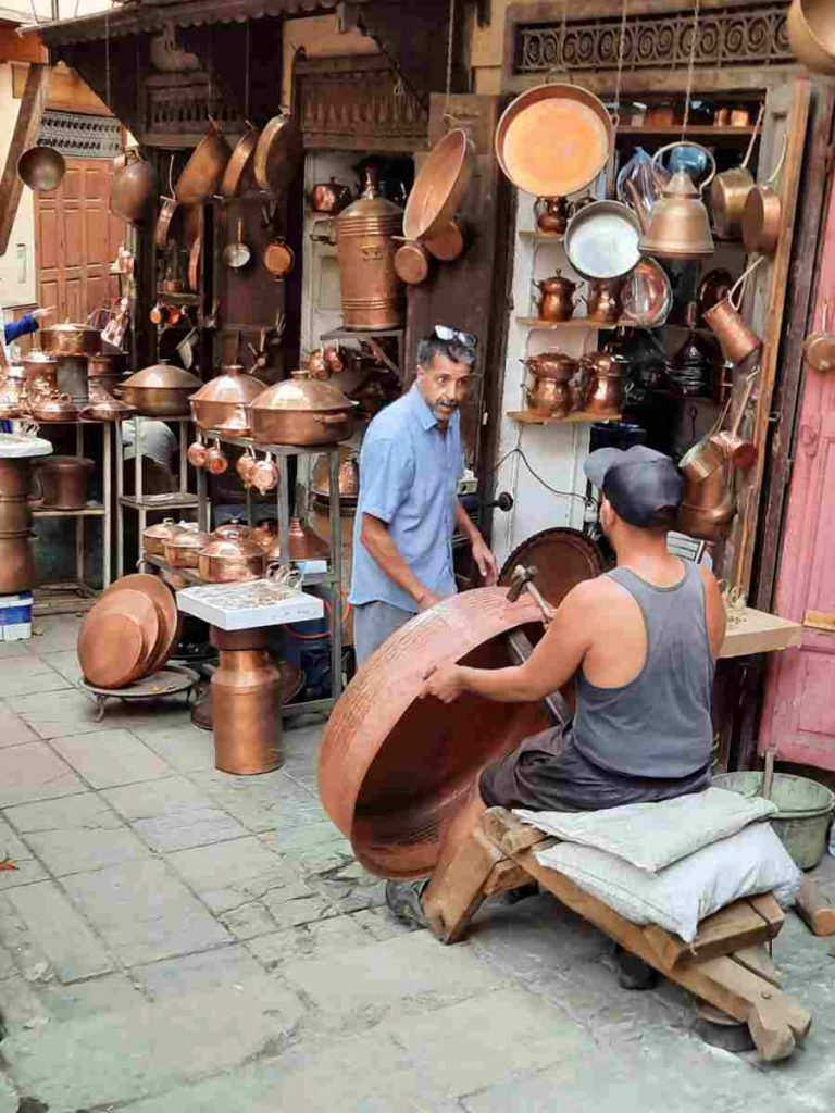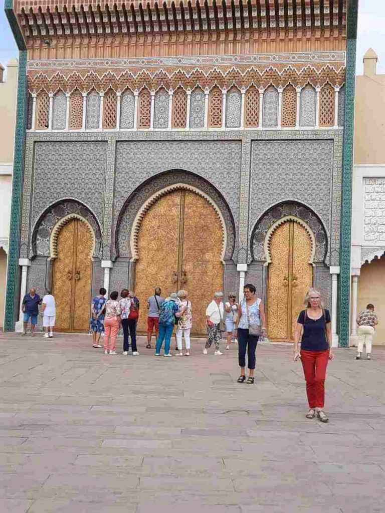 Changement de décor avec la ville de FÈS et la visite de la Médina de Fès el-Bali, une des plus grandes du mode arabe, classée au Patrimoine mondial de l’Unesco, avec ses échoppes traditionnelles, son artisanat : poteries, cuir,, tapis, objets en cuivre, épices…Moment marquant et odorant dans le quartier des tanneries Chouara. Malgré le brin de menthe, l’odeur de la fiente de pigeons utilisée pour assouplir les peaux, a soulevé le coeur de certains. Fès, c’est aussi la place En-Nejjarine avec sa très belle fontaine, le tombeau de Moulay Idriss II, le Palais Royal et son impressionnante porte dorée, la porte monumentale de Bab Boujloud. Une ambiance et une succession de petites merveilles.