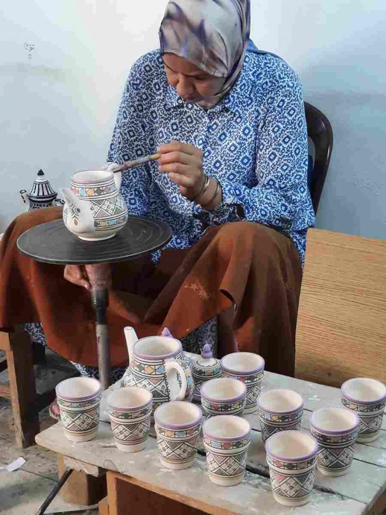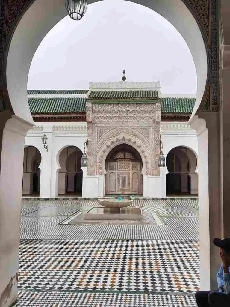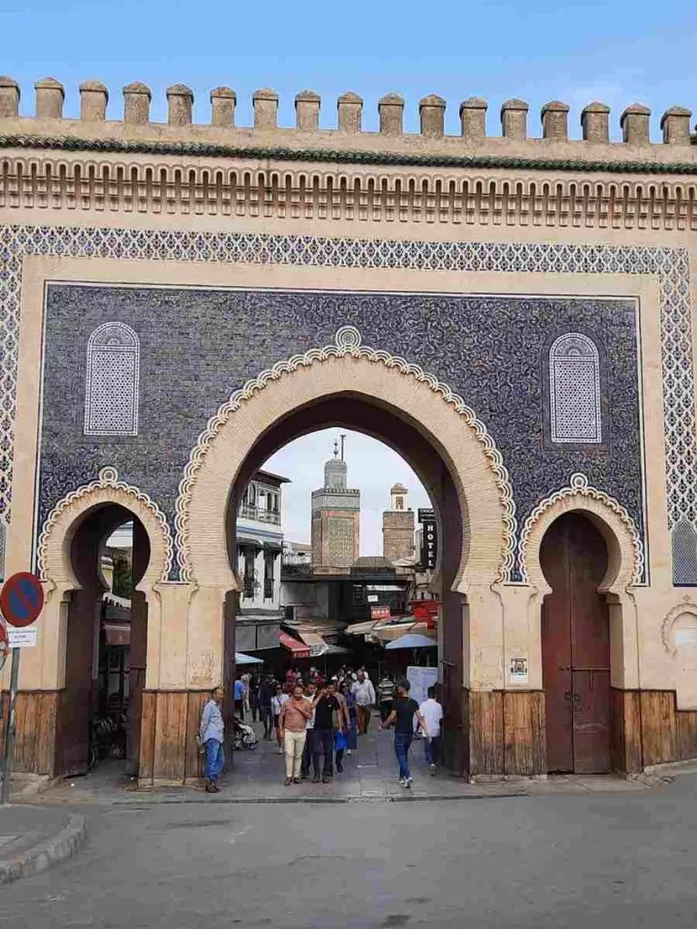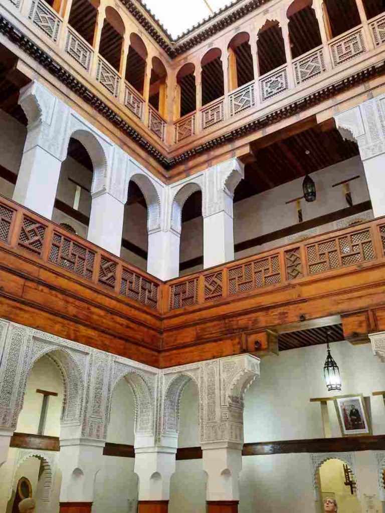 Changement de décor avec la ville de FÈS et la visite de la Médina de Fès el-Bali, une des plus grandes du mode arabe, classée au Patrimoine mondial de l’Unesco, avec ses échoppes traditionnelles, son artisanat : poteries, cuir,, tapis, objets en cuivre, épices…Moment marquant et odorant dans le quartier des tanneries Chouara. Malgré le brin de menthe, l’odeur de la fiente de pigeons utilisée pour assouplir les peaux, a soulevé le coeur de certains. Fès, c’est aussi la place En-Nejjarine avec sa très belle fontaine, le tombeau de Moulay Idriss II, le Palais Royal et son impressionnante porte dorée, la porte monumentale de Bab Boujloud. Une ambiance et une succession de petites merveilles.