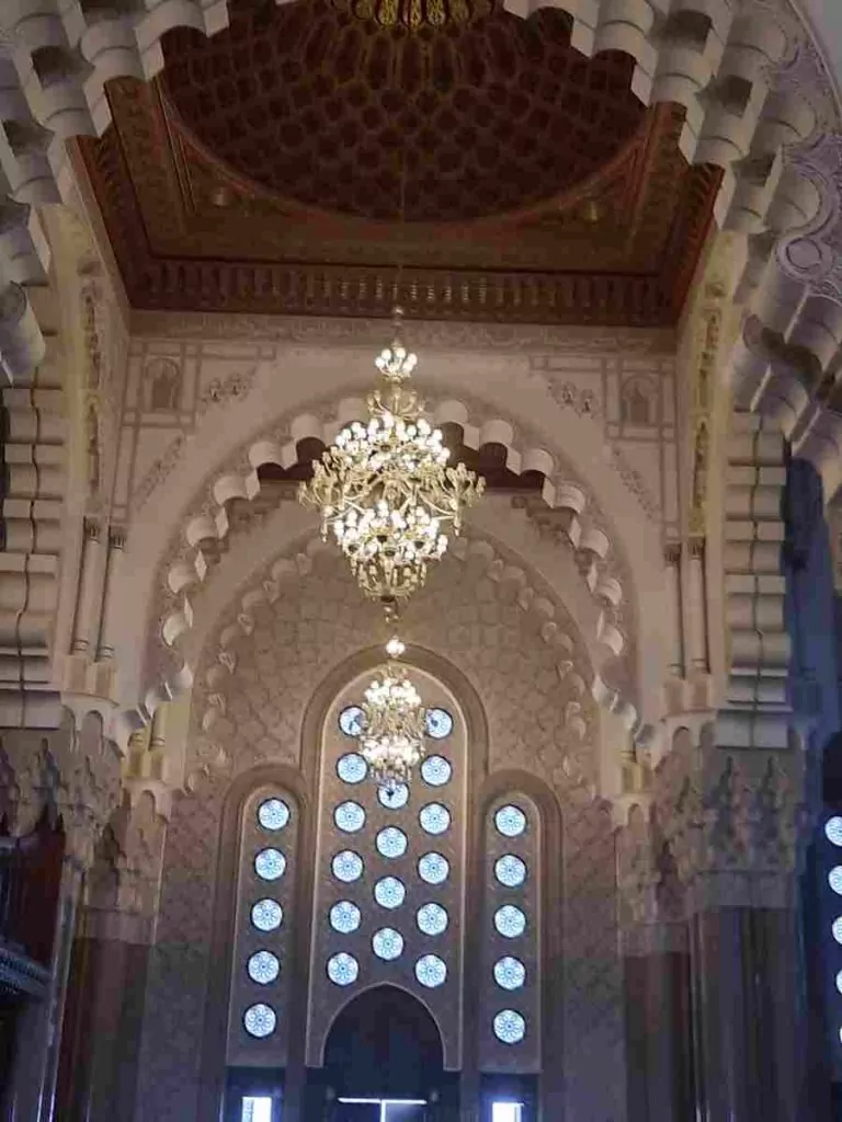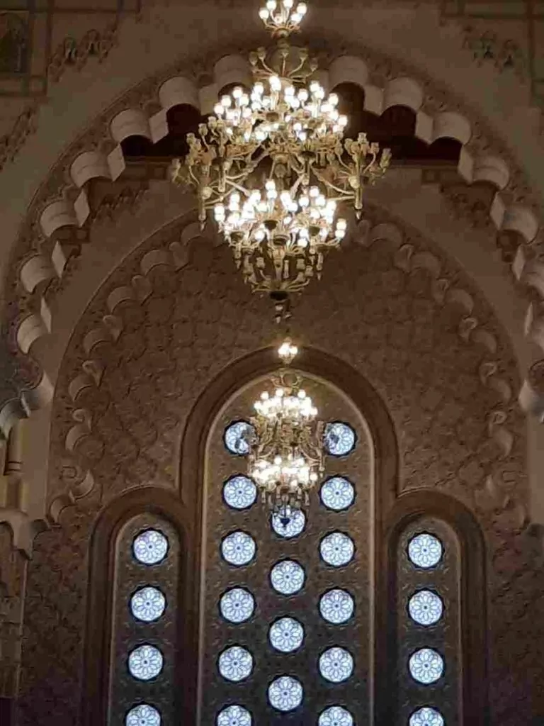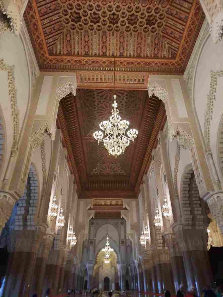 Ce qui frappe, dans cette mosquée, c’est d’avoir combiné les techniques les plus modernes dont un toit ouvrant sur rails de 1100 T et l’artisanat traditionnel marocain : des stucs, des plafonds de cèdre sculptés par des artisans de Fès et de Tétouan, des grands panneaux de zelliges. De toute beauté, 56 lustres de Murano, dont certains ont une envergure de 10m sur 6, s’abaissent, pour le nettoyage, avec une télécommande. Bref, la démesure !