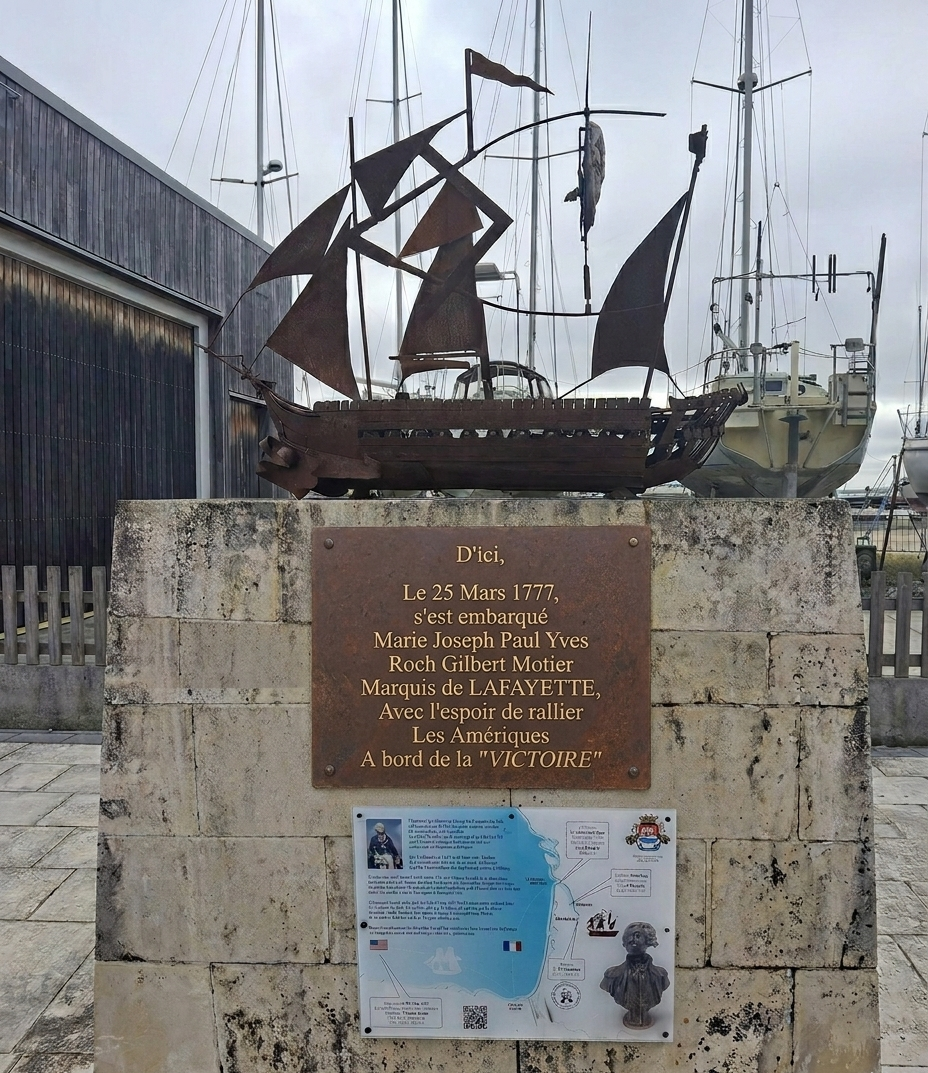 « Le 23 mars 1777, les préparatifs achevés, la Victoire appareille des Chartrons, descend la Garonne et fait escale à Pauillac, La Fayette redoutait la présence d’espions anglais très nombreux sur le port de Bordeaux. La Fayette l’y rejoint le 25, en chaloupe ou à cheval, déguisé en courrier.