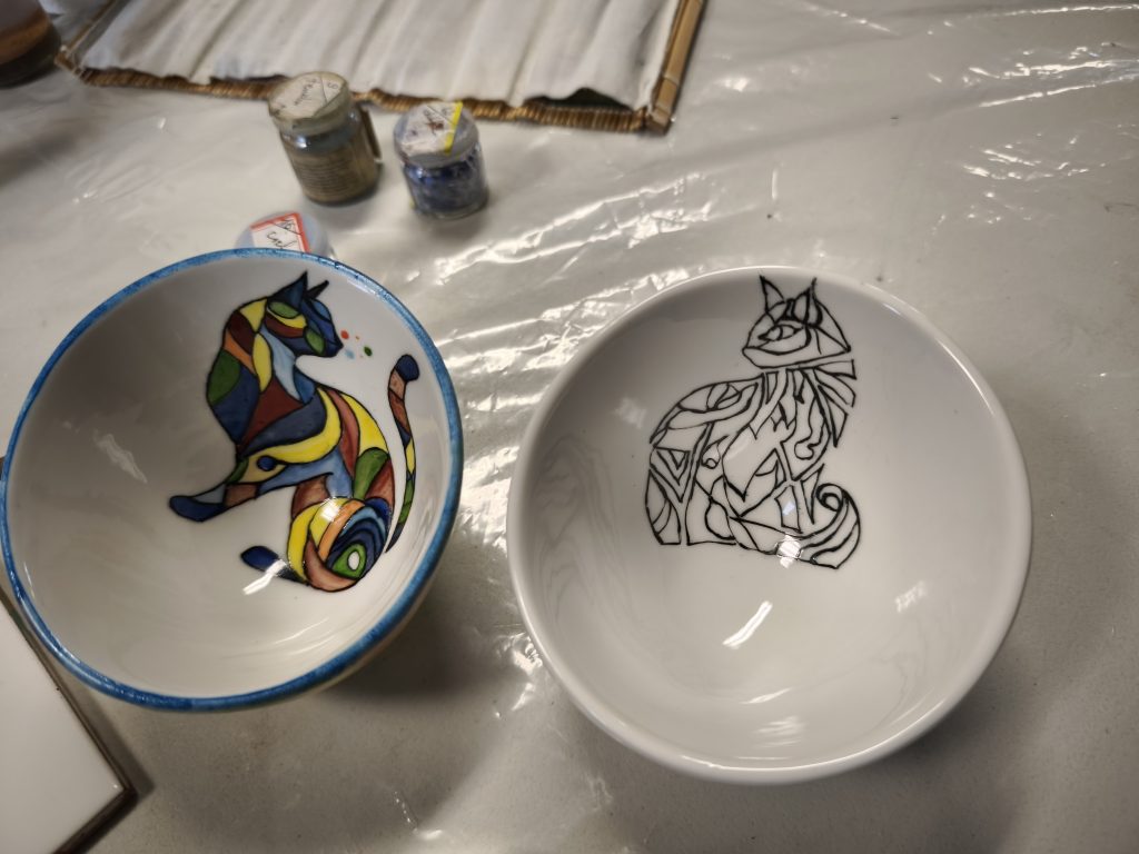 Une fois le motif choisi, dessine ou on décalque avec un papier spécial porcelaine. Le tracé s’effacera à la cuisson. Autre moment délicat, l’application de la peinture. Quelques règles s’imposent : bien préparer la peinture, peindre du haut vers le bas, peindre en caressant, délicatement, en évitant les petits coups de pinceaux, car la cuisson révèle tous les petits défauts. Après ces étapes vient le temps de la cuisson dans un four spécial : 4h à 450° puis 4h à 810°. Si un serti est fait, il cuira en premier. Pour décorer et donner une touche délicate et festive, l’or liquide est, parfois, utilisé par petites touches.