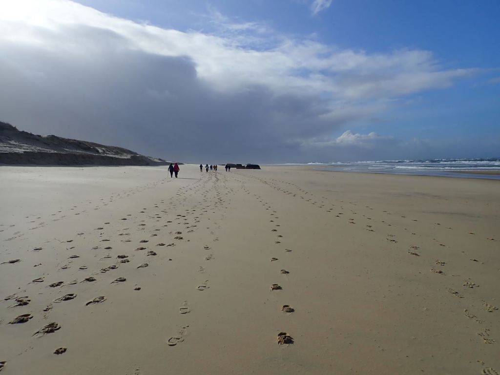 Le matin, depuis la longe du Mimbeau direction l’océan où nous trouvons une plage immaculée, et une forte érosion dunaire avec un coefficient de marée de 100.