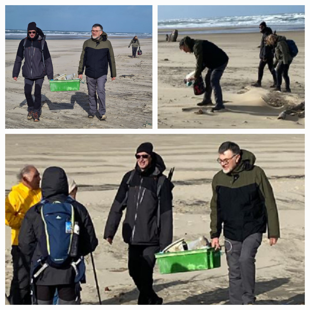 Le matin, depuis la longe du Mimbeau direction l’océan où nous trouvons une plage immaculée, et une forte érosion dunaire avec un coefficient de marée de 100.