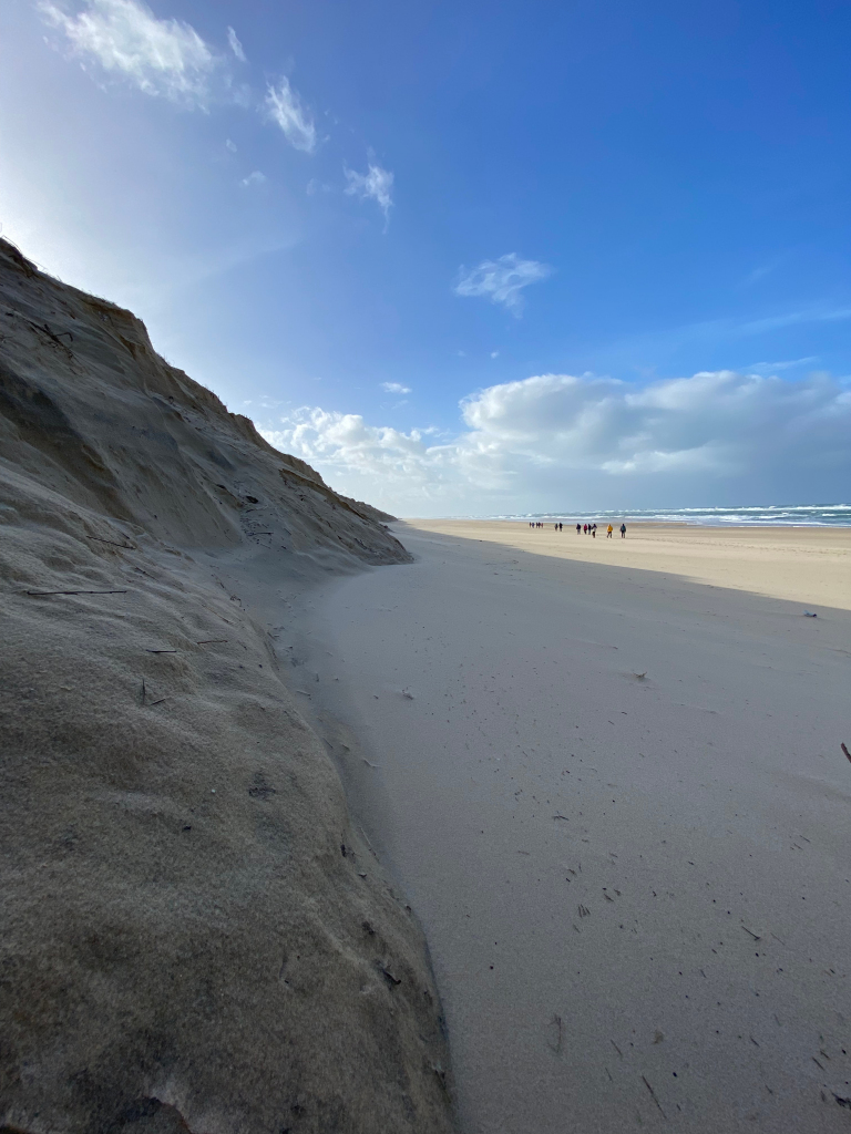 Le matin, depuis la longe du Mimbeau direction l’océan où nous trouvons une plage immaculée, et une forte érosion dunaire avec un coefficient de marée de 100.