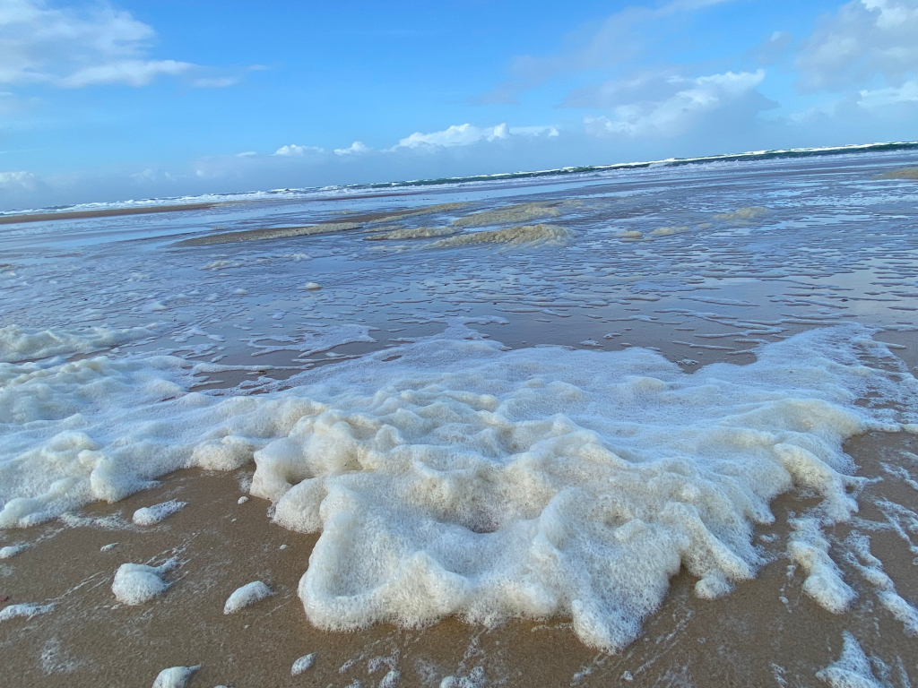 Le matin, depuis la longe du Mimbeau direction l’océan où nous trouvons une plage immaculée, et une forte érosion dunaire avec un coefficient de marée de 100.