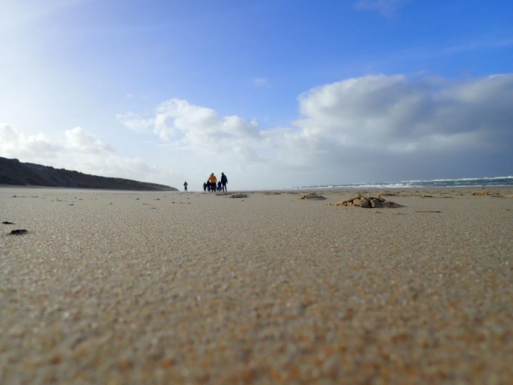 Le matin, depuis la longe du Mimbeau direction l’océan où nous trouvons une plage immaculée, et une forte érosion dunaire avec un coefficient de marée de 100.