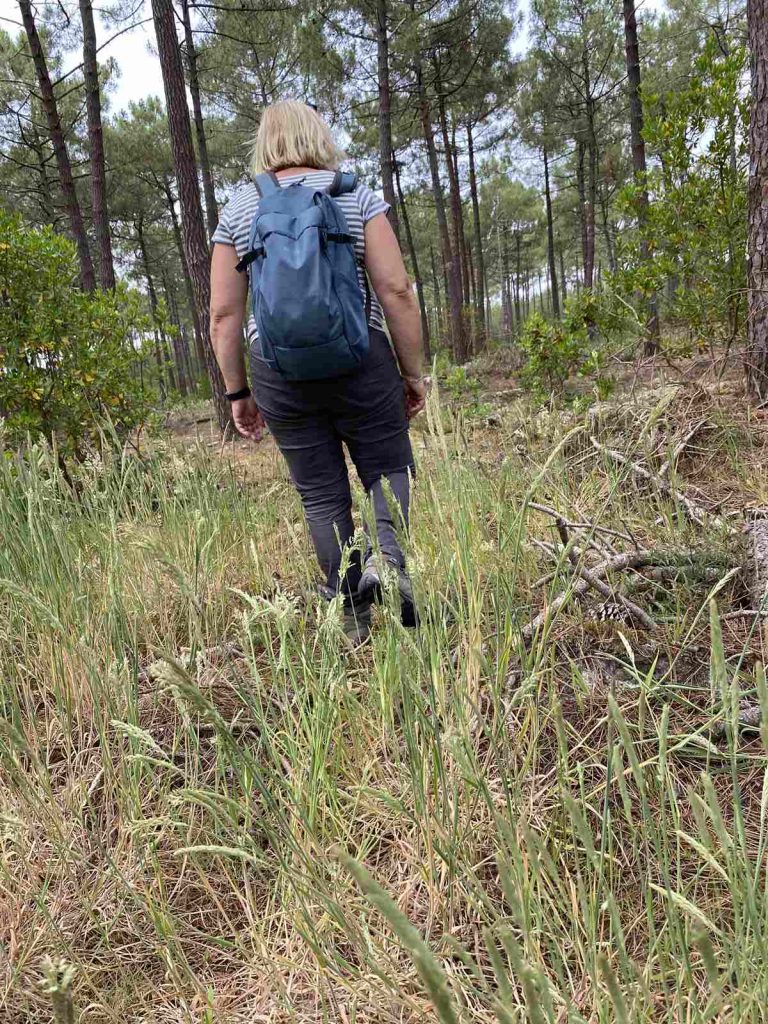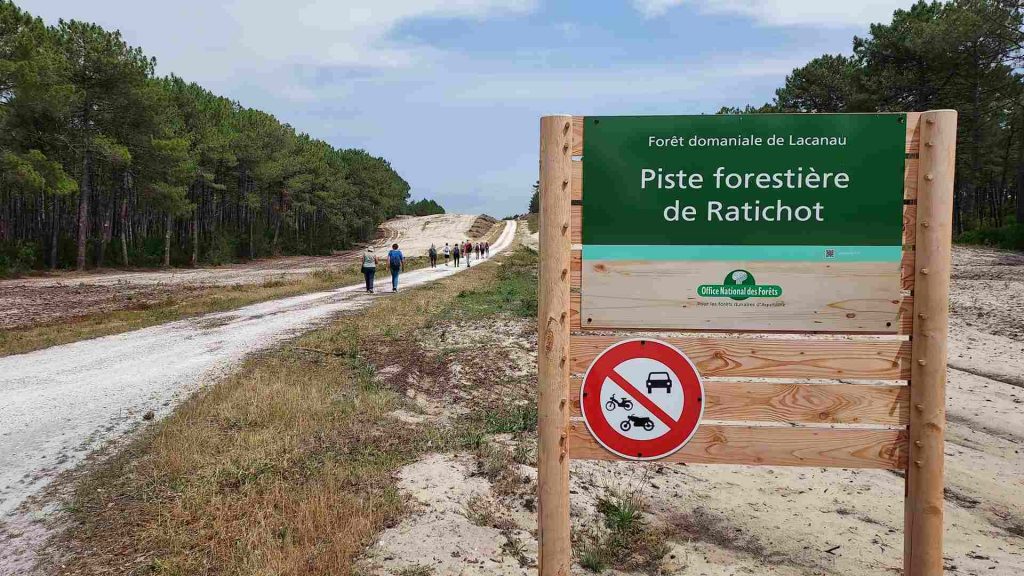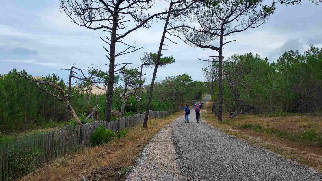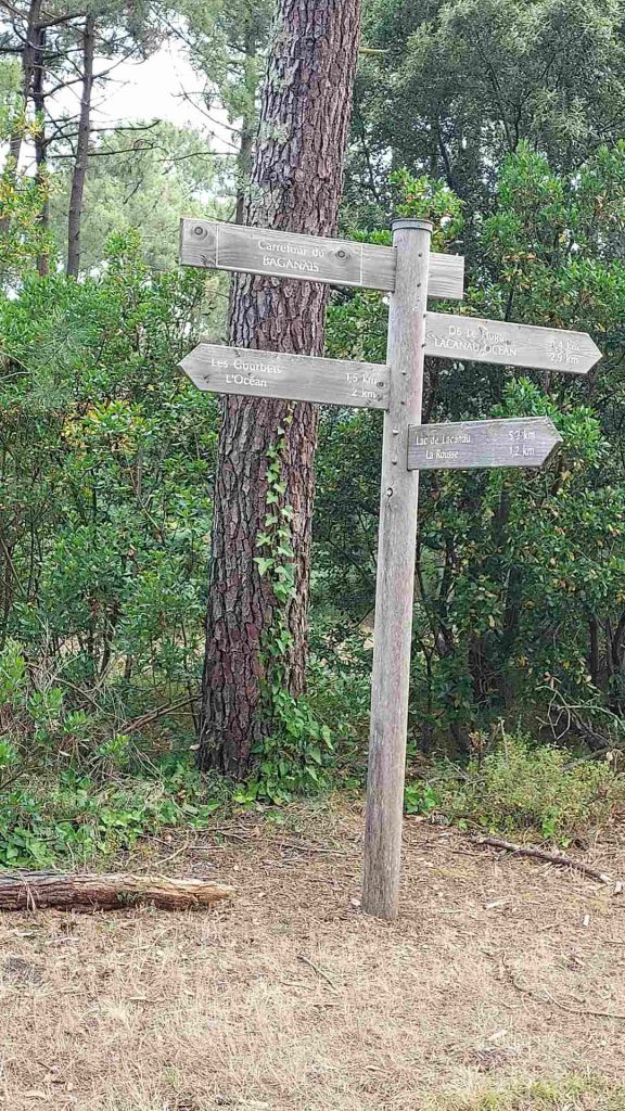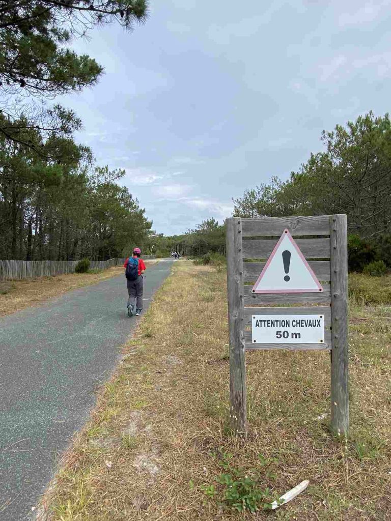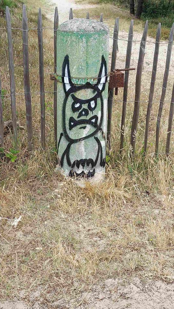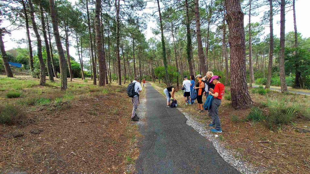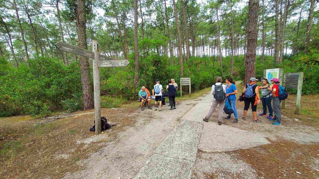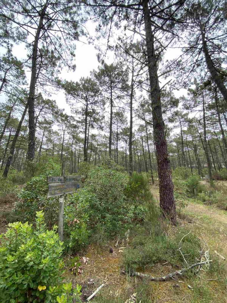 … Nous avons commencé la matinée en douceur sur une piste forestière au cœur de la majestueuse forêt des landes de Gironde. Le chemin, bordé de pins et tapissé d’aiguilles, offrait une ombre bienfaisante et une ambiance sereine. En sortie de forêt, nous avons retrouvé une piste goudronnée, lisse et bien entretenue. Un vrai plaisir pour la marche. Dans ce dédale, une portion plus inattendue nous attendait ensuite : une piste en dalles de béton, vestige des infrastructures du mur de l’atlantique. Bien droite, austère mais robuste, elle témoigne d’une autre époque. Un rappel que l’Histoire est parfois inscrite jusque dans le sol…