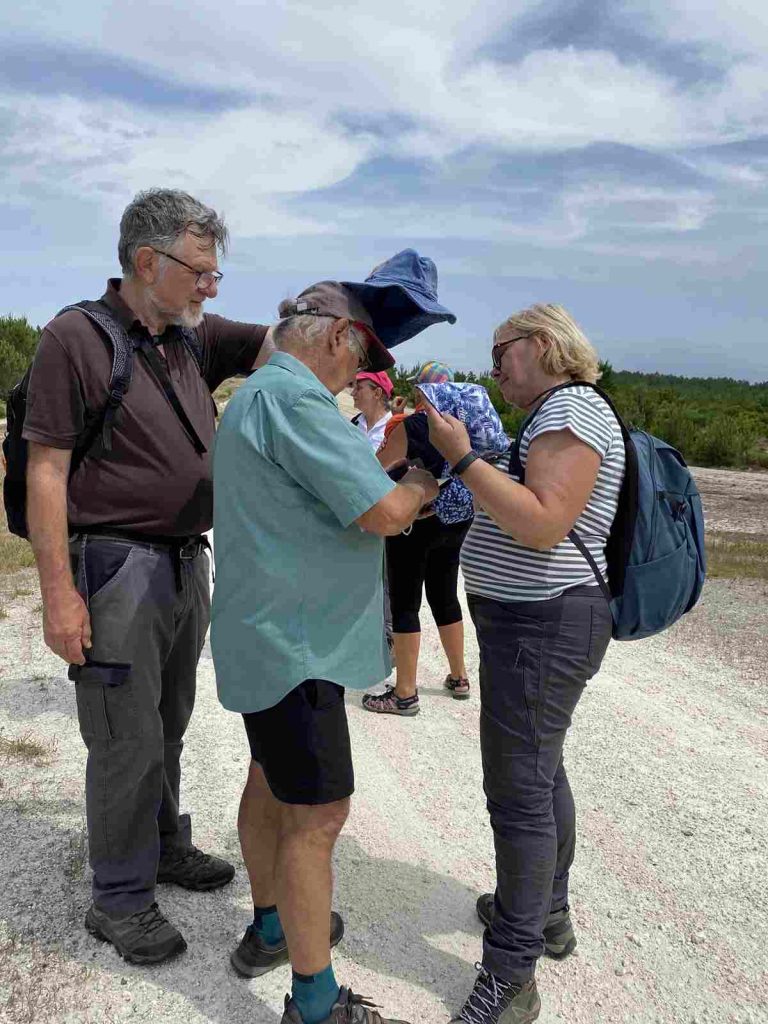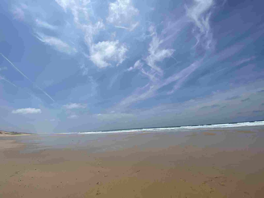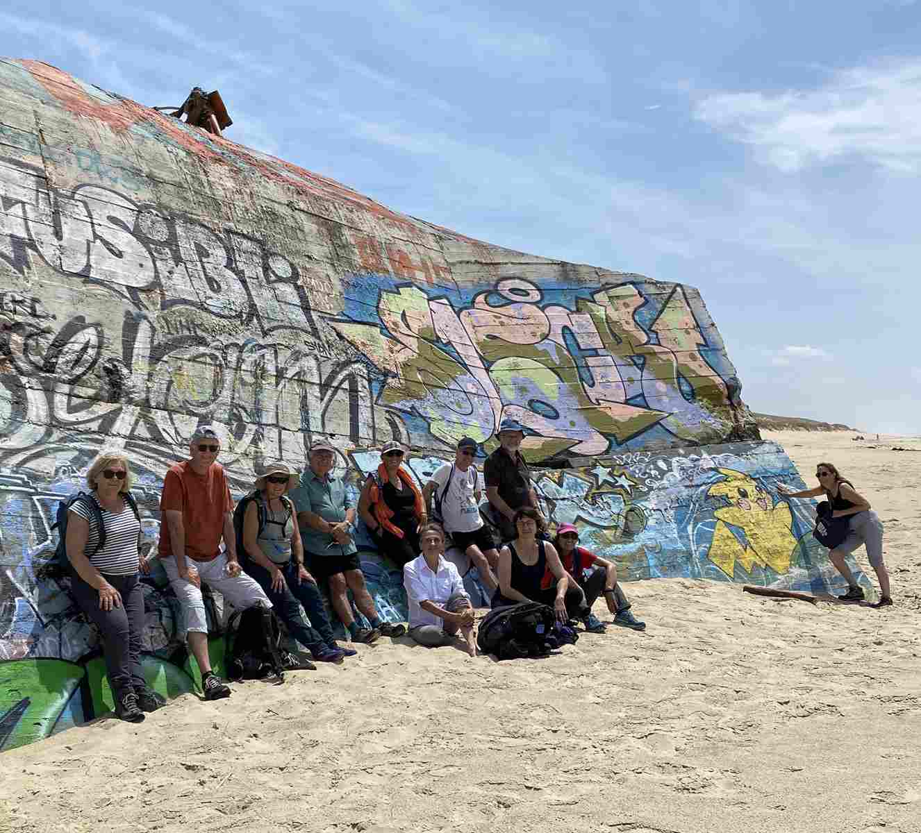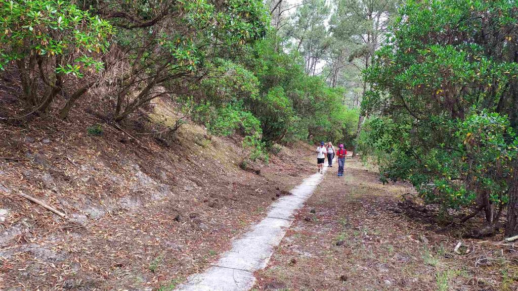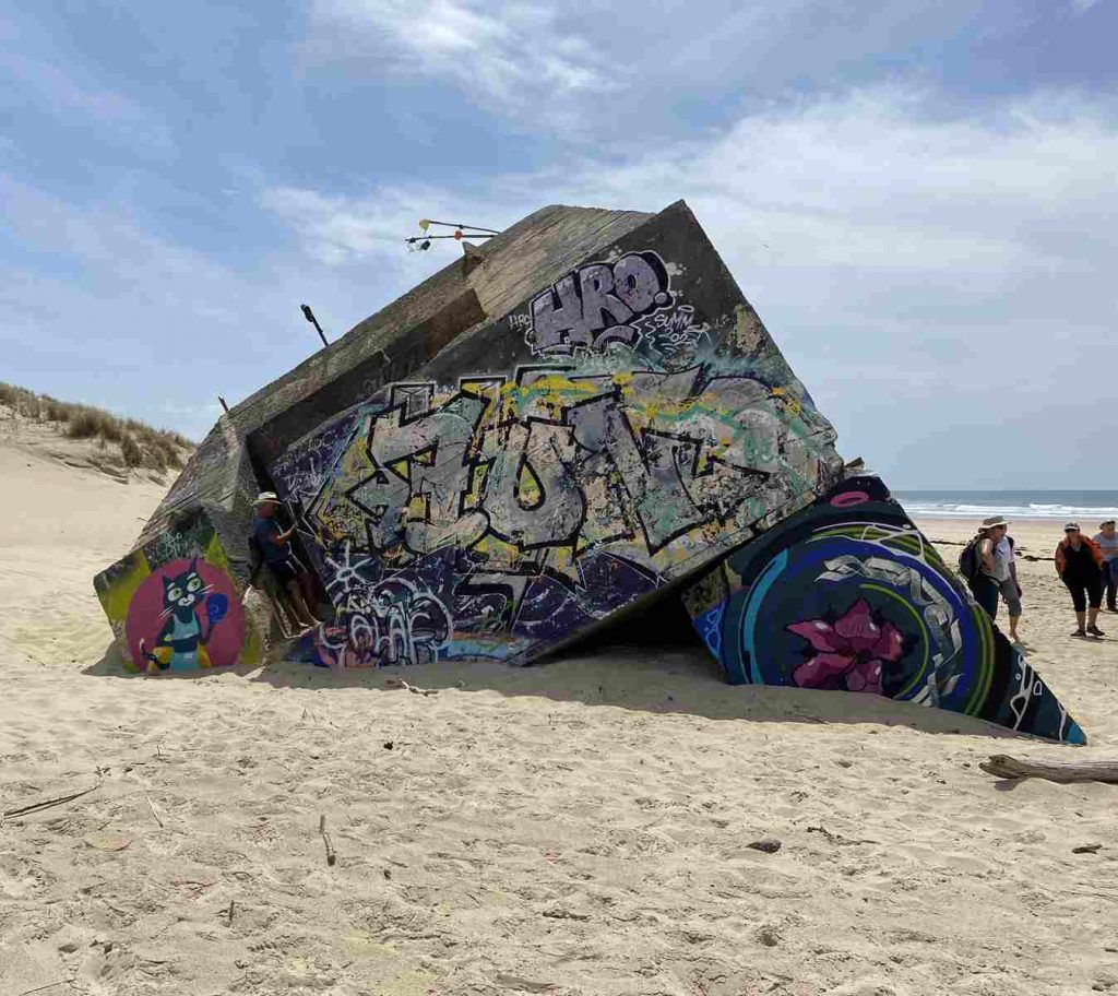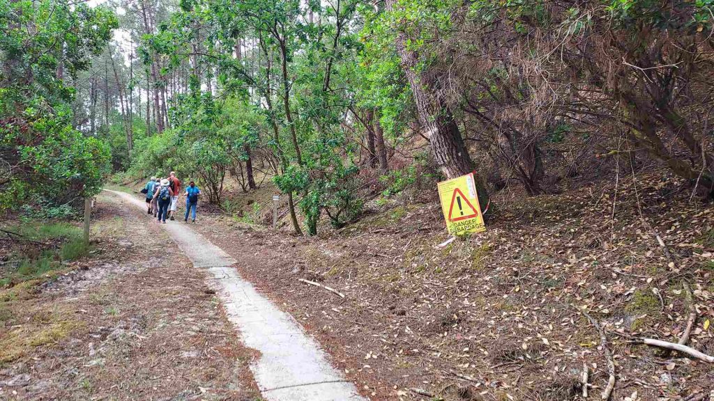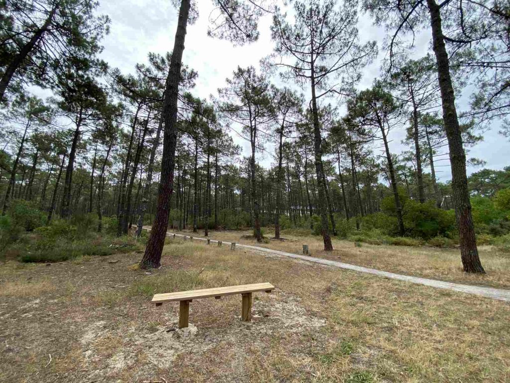 … Nous avons commencé la matinée en douceur sur une piste forestière au cœur de la majestueuse forêt des landes de Gironde. Le chemin, bordé de pins et tapissé d’aiguilles, offrait une ombre bienfaisante et une ambiance sereine. En sortie de forêt, nous avons retrouvé une piste goudronnée, lisse et bien entretenue. Un vrai plaisir pour la marche. Dans ce dédale, une portion plus inattendue nous attendait ensuite : une piste en dalles de béton, vestige des infrastructures du mur de l’atlantique. Bien droite, austère mais robuste, elle témoigne d’une autre époque. Un rappel que l’Histoire est parfois inscrite jusque dans le sol…