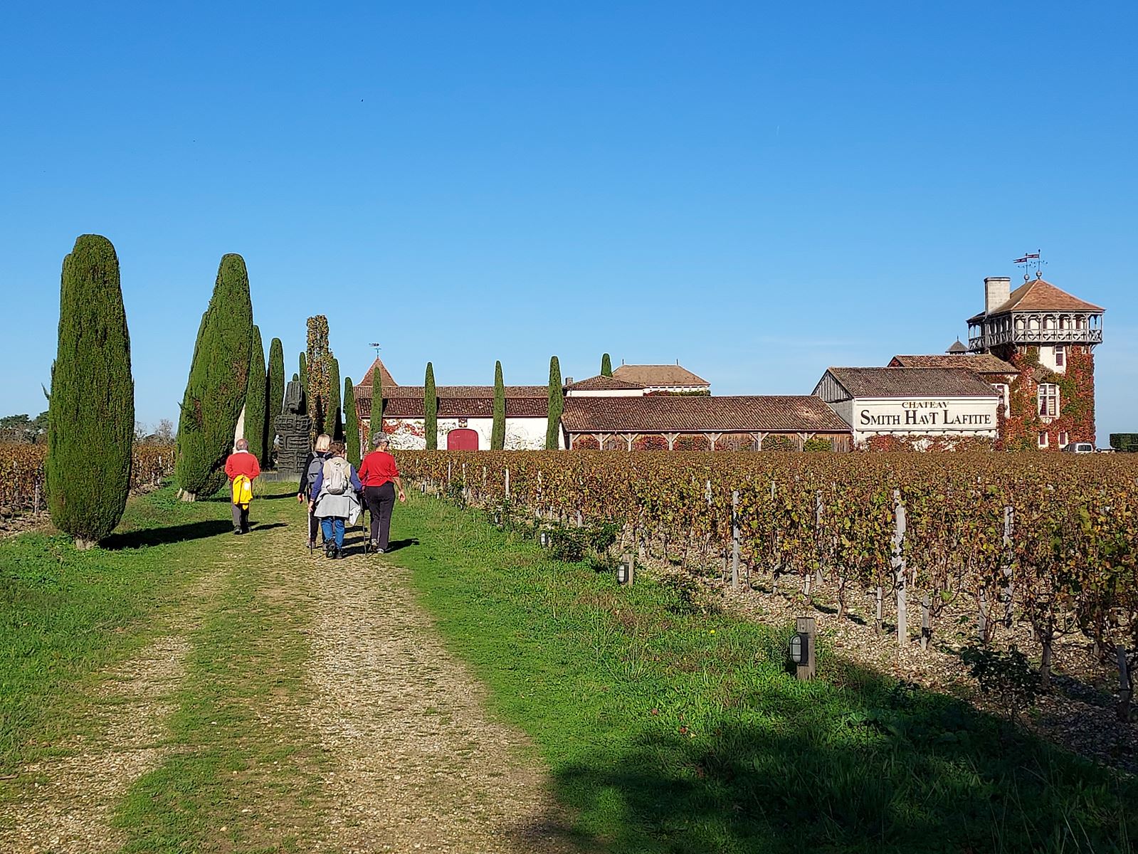 Nous avons relié les châteaux du cru, Château Haut Bailly, les Sources de Caudalie, avec le Châteav Smith Havt Lafitte, et ses œuvres d’art contemporaines, le Château « La Louvière », Château Carbonnieux sur le chemin du retour, notre attention a été attirée par le passage des grues cendrées.
